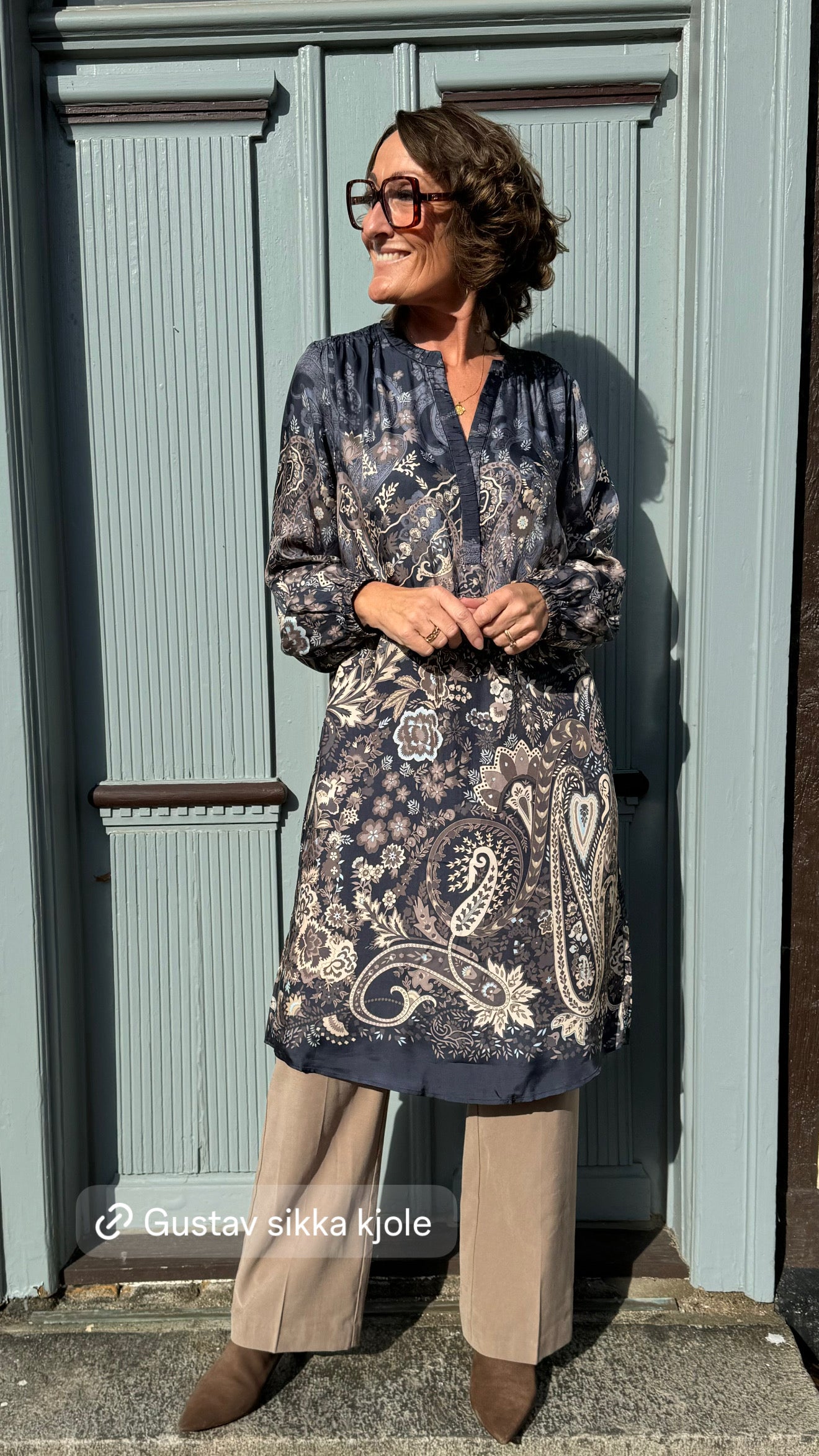 Brune bukser med blå skjorte