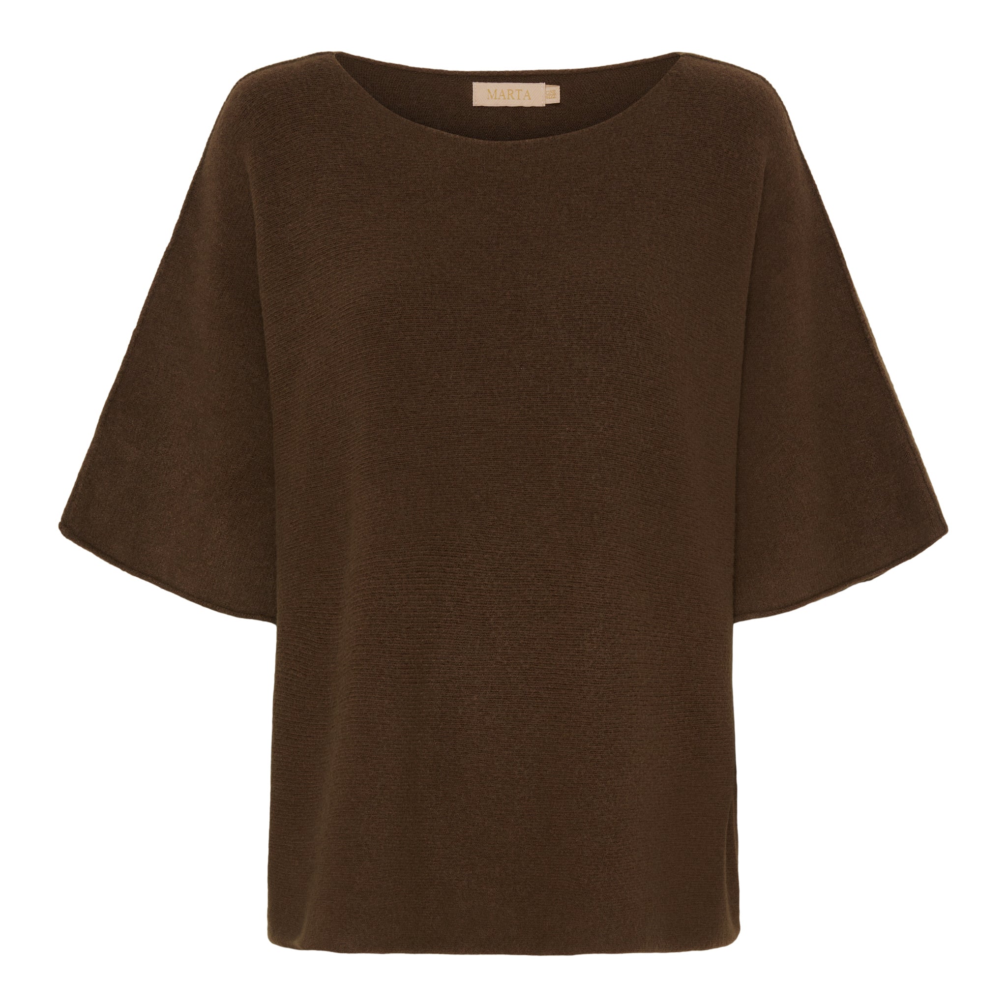 Brun strikbluse fra Marta du Château med 3/4 ærmer og bådudskæring. Perfekt til et par jeans eller et par off white bukser, hvis du gerne vil fremhæve den brune farve på strikken.Mål:OnesizeChest: 124 cm.Length: 66 cm.