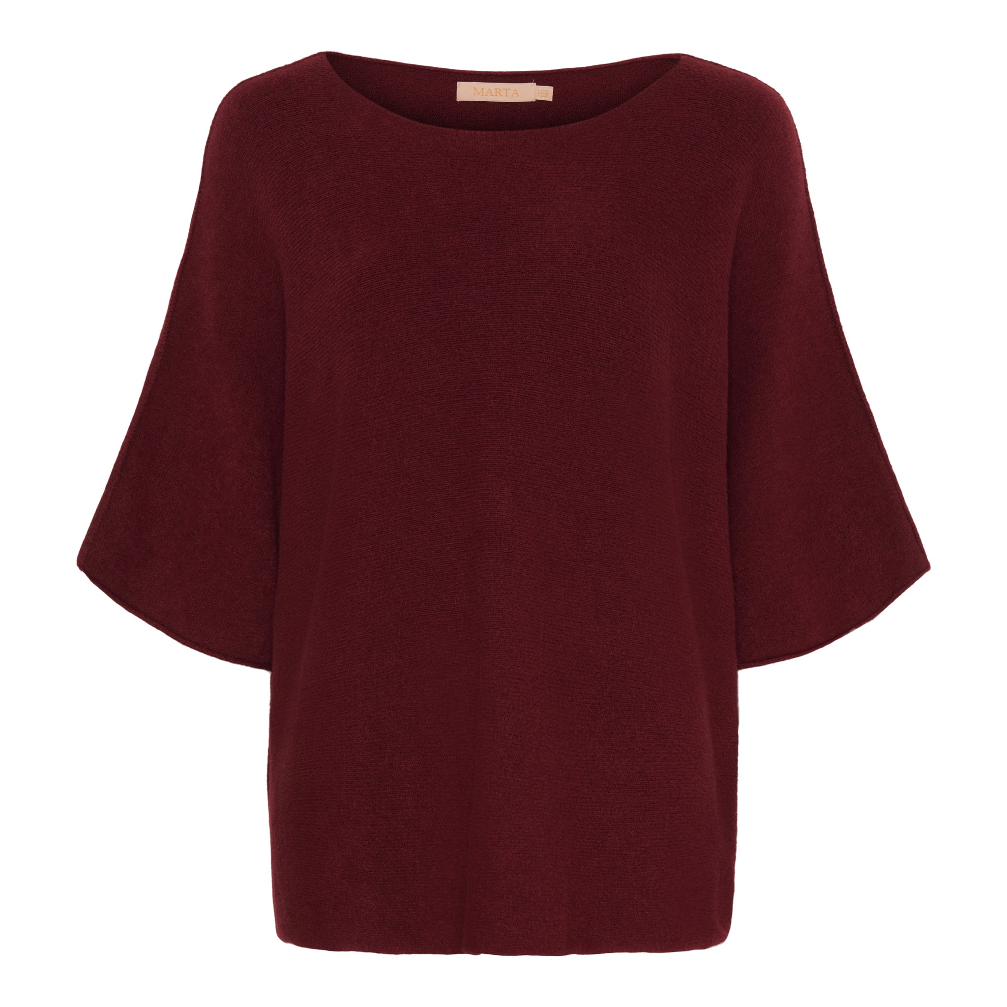 Den bordeaux farvede Sia strik fra Marta du Château er en af vores bedst solgte strikbluser. Farven er lige i skabet og er flot både til sorte og lyse bukser. De 3/4 lange ærmer giver blusen en let fornemmelse.Mål:OnesizeChest: 124 cm.Length: 66 cm.