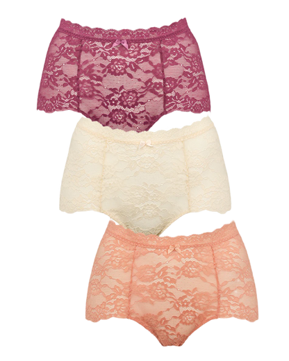 Den populære lace maxi fra Missya er tilbage i smukke forårsfarver. I 3-pakken finder du en ivory, peach og burgundy. Du får altså 3 lækre par blondetrusser. Det er ikke uden årsag at lace maxi trusserne er blevet så populære. De er super bløde at have på og lækker sig flot ind til huden. Det betyder, at du kan bruge lace trusserne under tætsiddende bukser og nederdele uden at bekymre dig om synlige overgange.Denne maxi trusse er lille i størrelsen. Vi anbefaler, at du vælger en størrelse større i forhold til din normale størrelse.