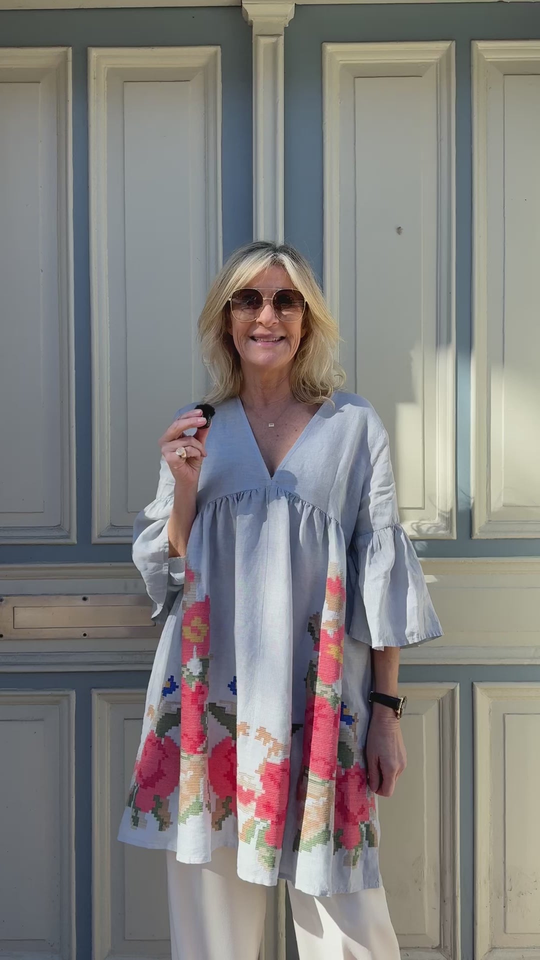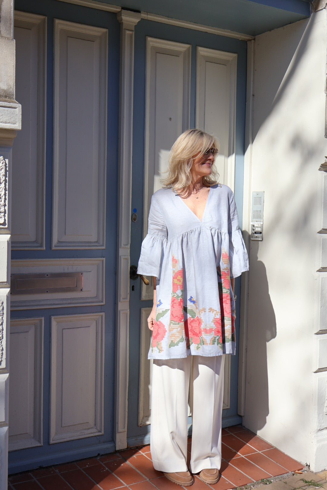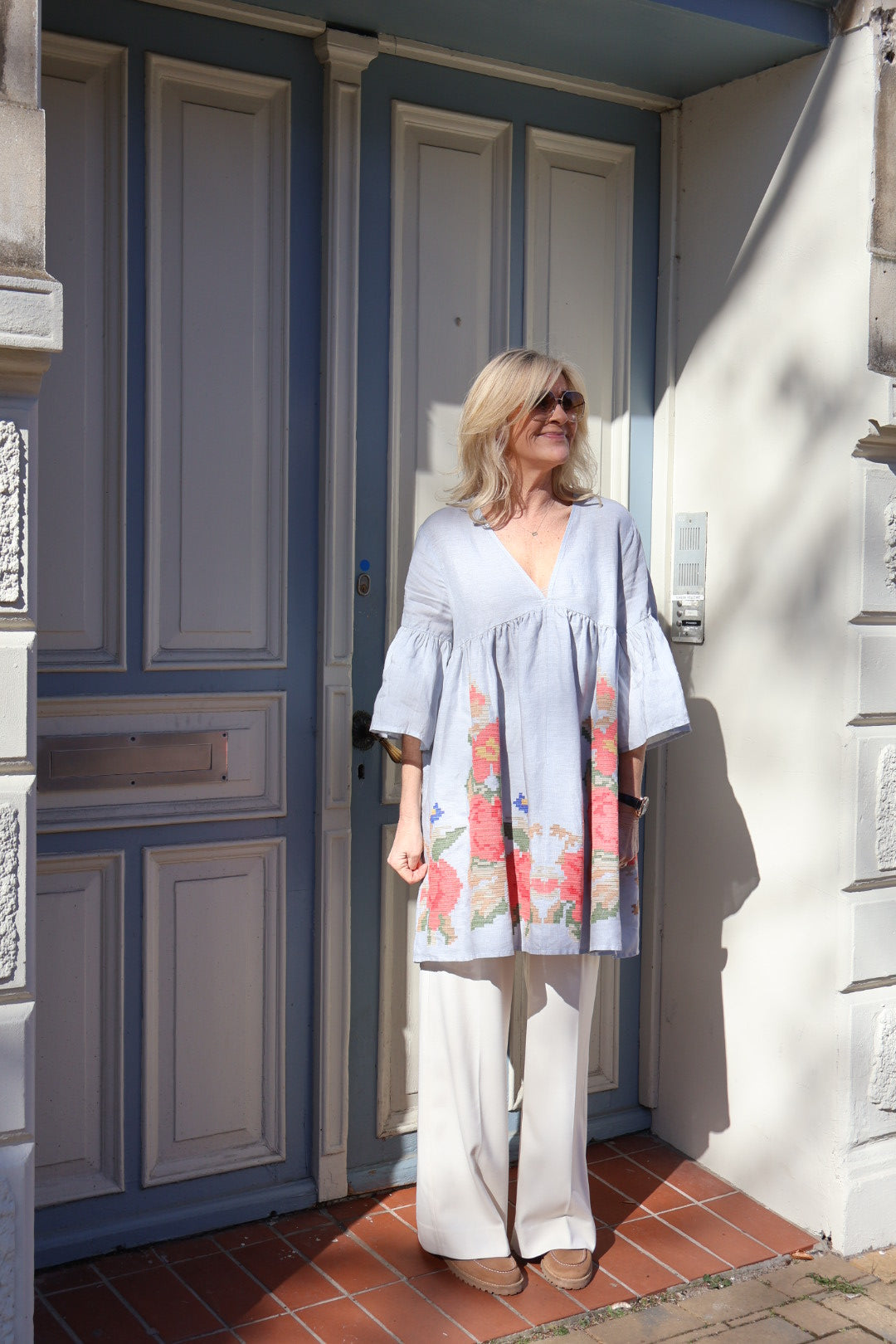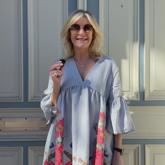 Søde klokkekjole fra Kori i lysegråt hør. Kjolen er deokreret med de fineste blomster broderier i bunden i fine koralfarver. Kjolen har en dyb v-udskæring og korte ærmer i klokkefacon. En virkelig sød kjole du nemt styler over et par lyse bukser, mens det endnu er for koldt til kjoler. Til sommer bliver det din nye yndlingskjole, du nemt snupper med på ferien. Style med støvler og en strømpebuks til at starte med og gå over til bare ben og sandaler, når vejret bliver dejligt varmt.