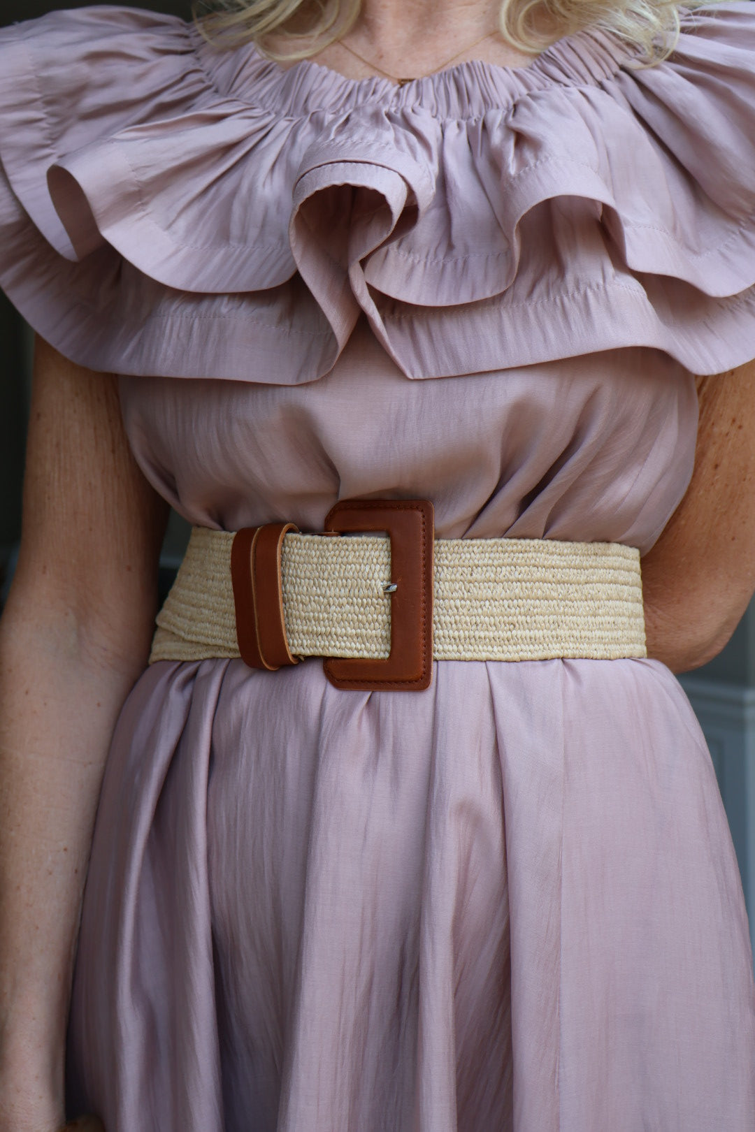 Bredt bælte fra Vanzetti med masser af elastik. Bæltet er lavet i et cool materiale, der minder om bast, men er meget elastisk, så bæltet kan strække sig. Det brede spænde giver en flot afslutning. Style dit bælte over en kjole for at sætte fokus på taljen som vist på billedet. Du kan også fint bruge det over din blazer.