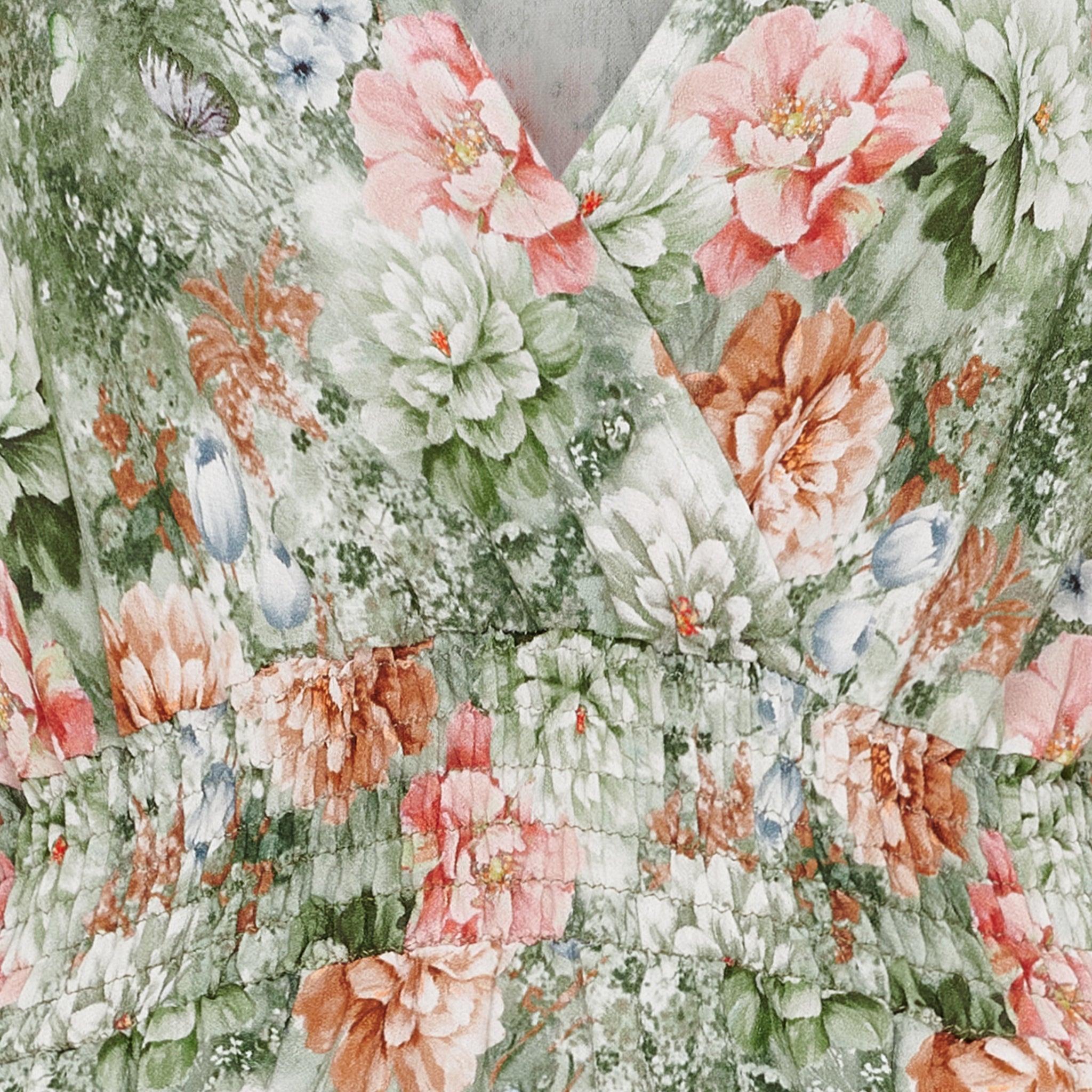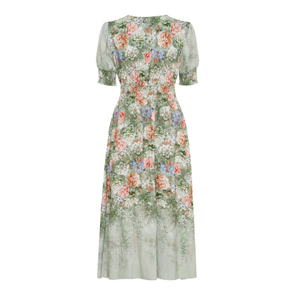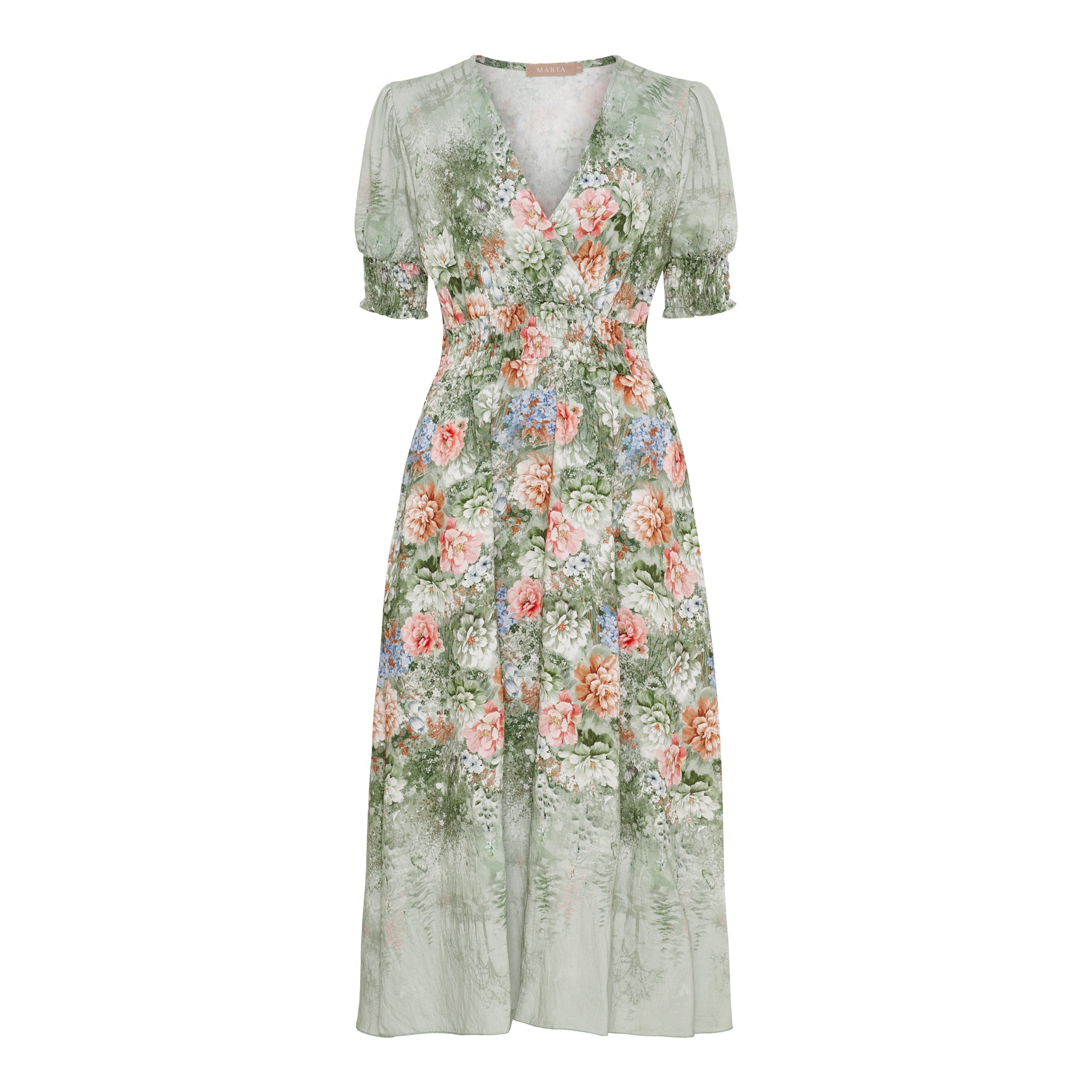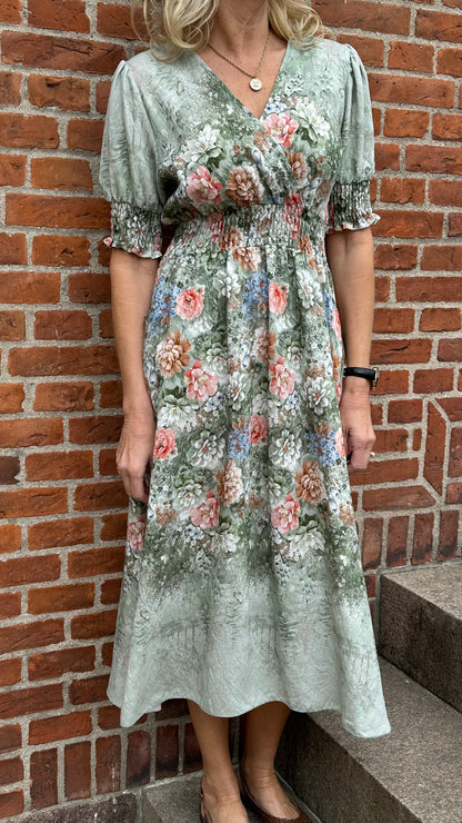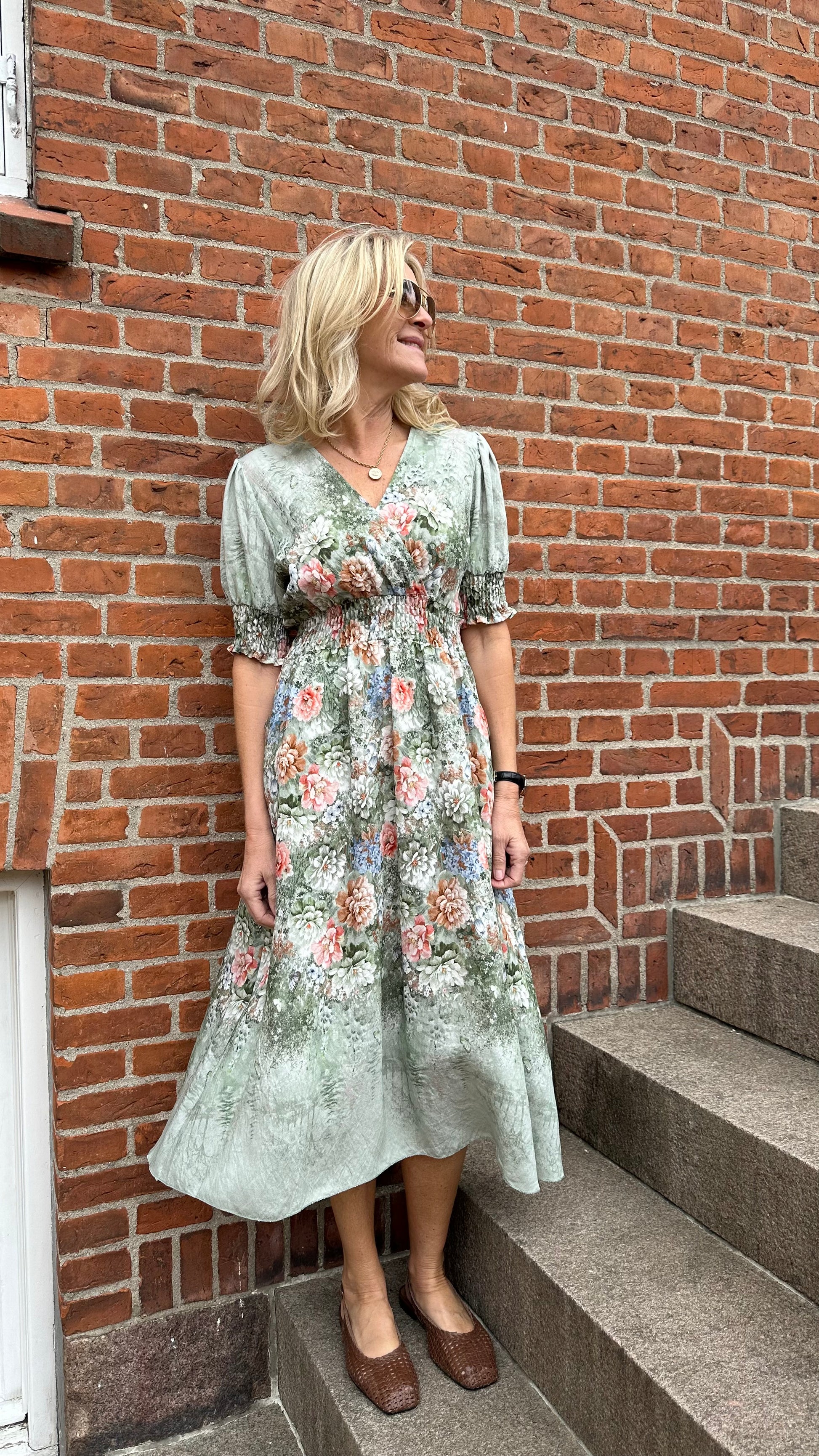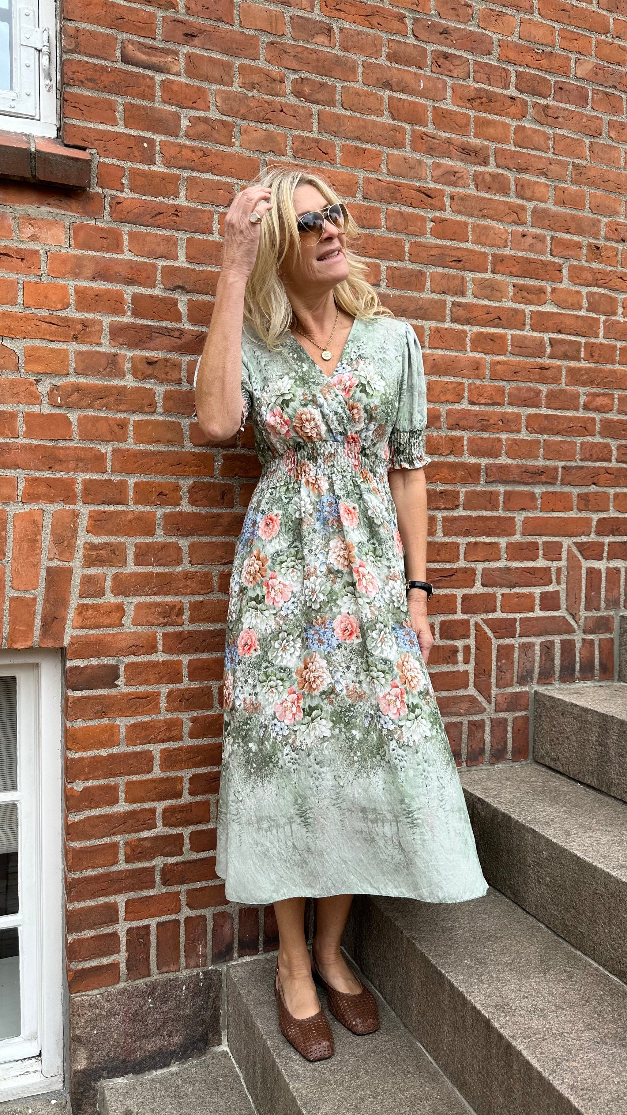 Sød sommerkjole fra Marta du Château i støvet grøn viskose. Kjolen har korte ærmer afsluttet med smock. Sød til sommerfesten med en fin sandal.