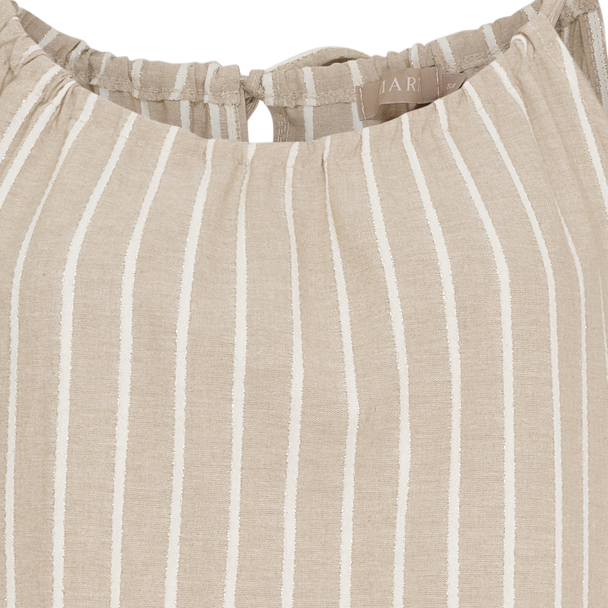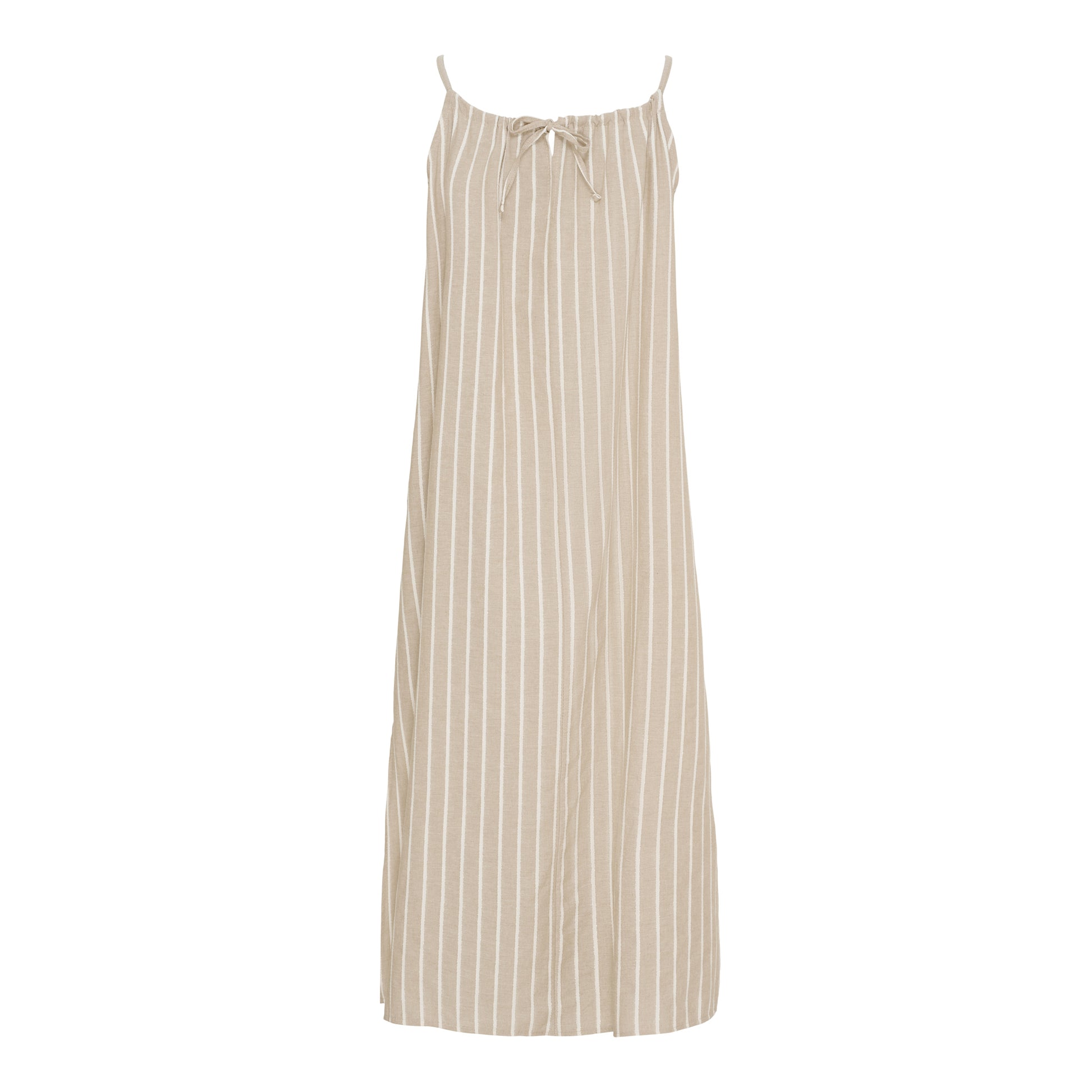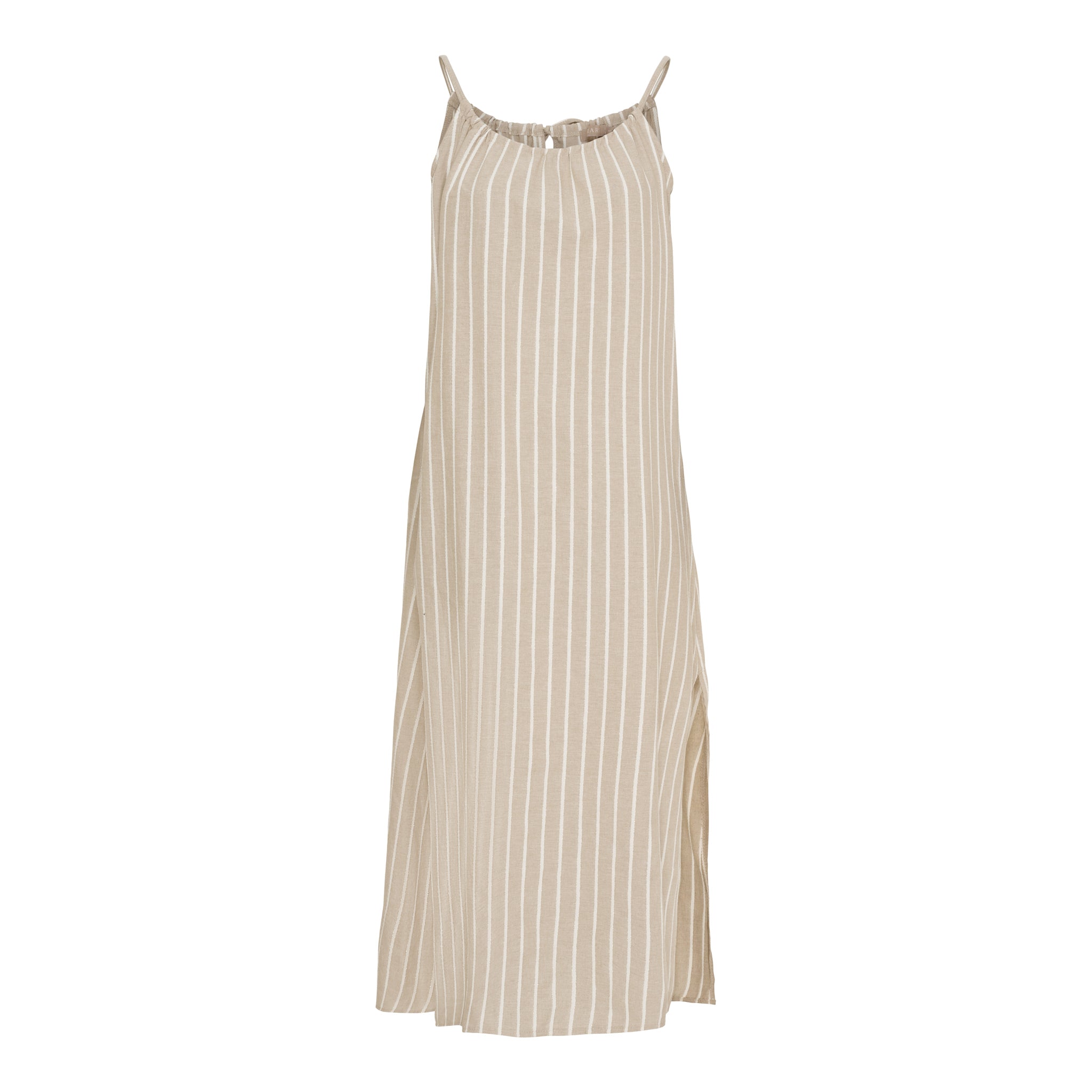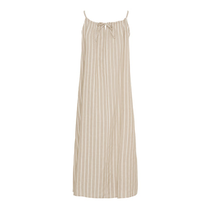 Sød stropkjole fra Marta du Château i beige bomuld med lyse striber og gylden lurex. Kjolen har slidser i siderne og lukkes på ryggen med snører. Det betyder, at du selv bestemmer hvor løs eller stram kjolen skal være i halsudskæringen. Du finder også den søde stropkjole i farven lyseblå.