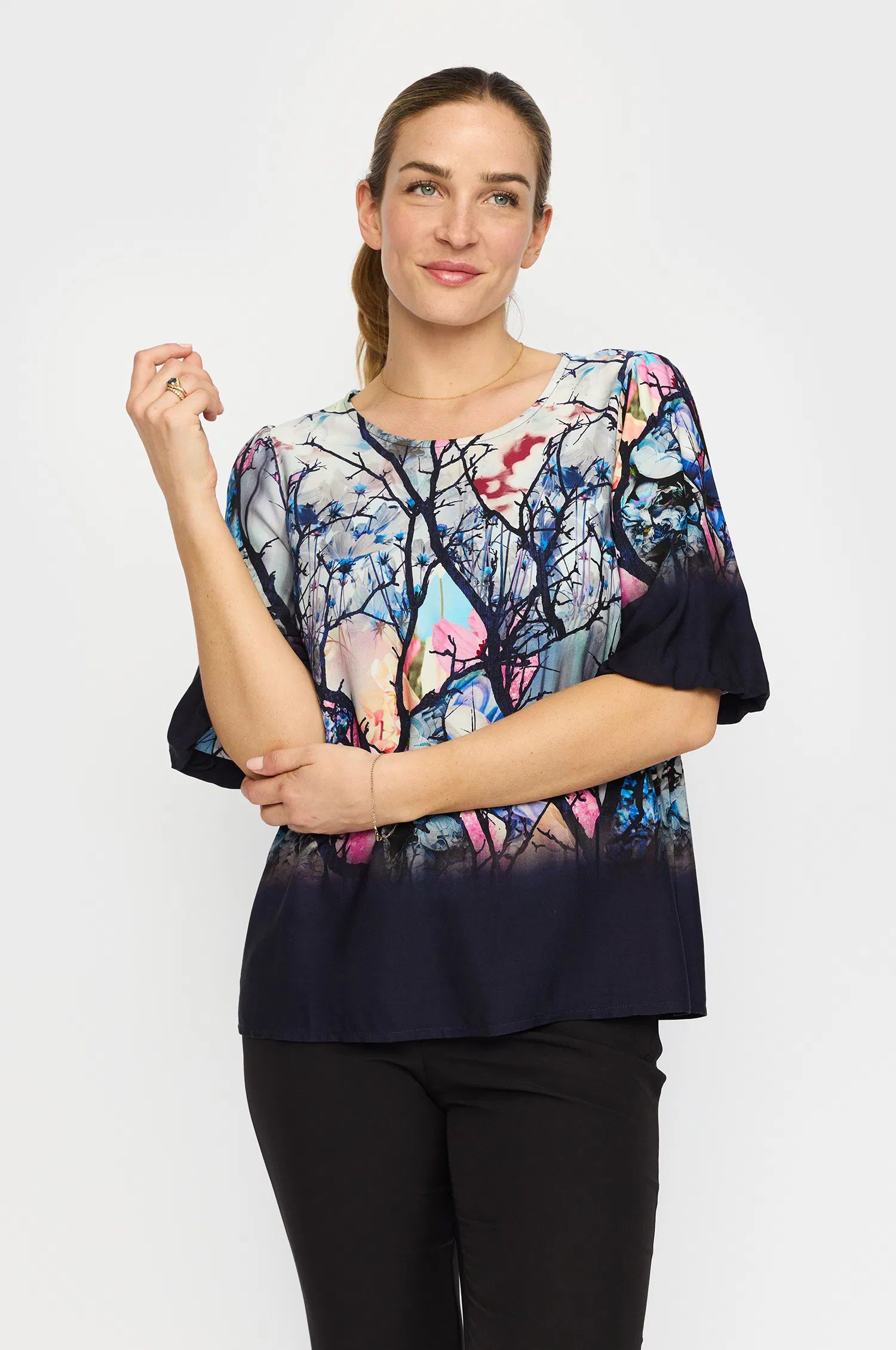Flot mørkeblå bluse fra 2-Biz med 3/4 lange ærmer. Blusen har et fint print på forsiden i lækre farver. Style til dine sorte bukser eller shorts.