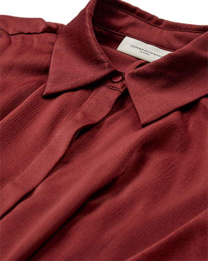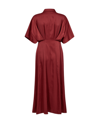 Flot, lang kjole fra Copenhagen Muse i den nye must have farve. Snittet er skåret som en sommerfuglkjole, hvor du får en virkelig flot talje og fine, voluminøse ærmer. Kjolen har gennemgående knapper skjult bag stolpelukningen. Det blanke materiale giver kjolen sit eksklusive look. Perfekt til både sommerfesten og til efteråret. Style med gyldne sandaler nu og fremhæv den dybe, røde farve. Til efteråret er kjolen flot med støvler eller stiletter.