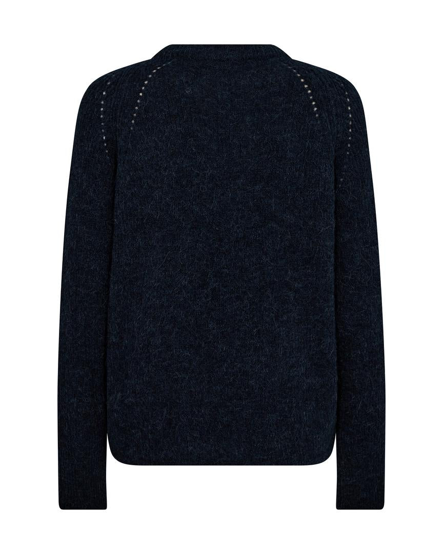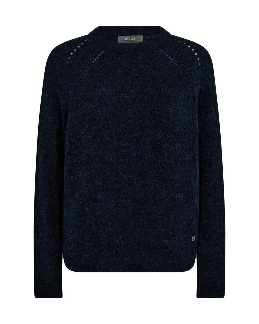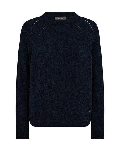 Skøn, mørkeblå strik fra Mos Mosh. Strikblusen har et flot hulmønster ved raglanærmerne. Den melerede farve er flot til et par jeans. Der er både alpaca og uld i materialet, så strikken er god varm på kolde dage.