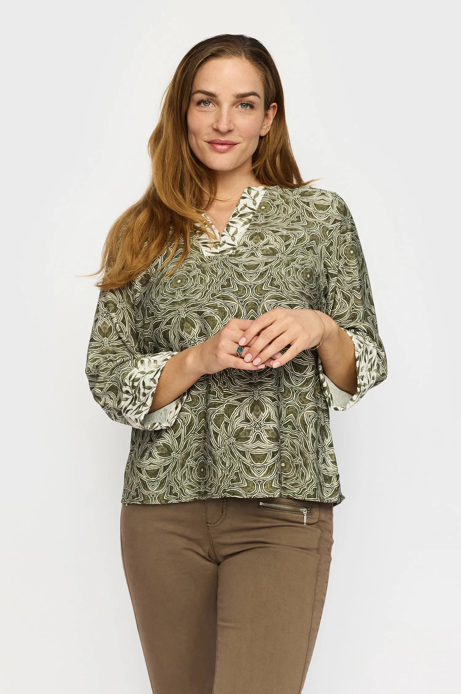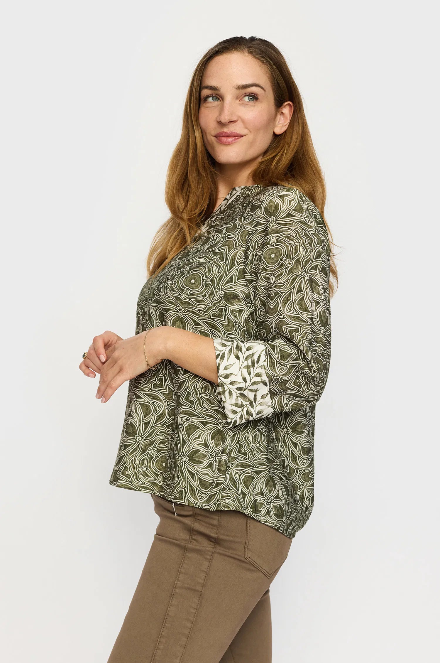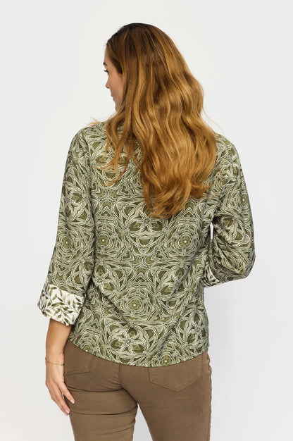 Fin bluse fra 2-Biz i army grøn viskose. Blusens manchetter og halsudskæring er kantet med et andet print, som bryder på flot vis. Style den grønne bluse til hvide bukser her i sommersæsonen. Sørg for at du også får glæde af blusen til efteråret til et par jeans eller sorte bukser.