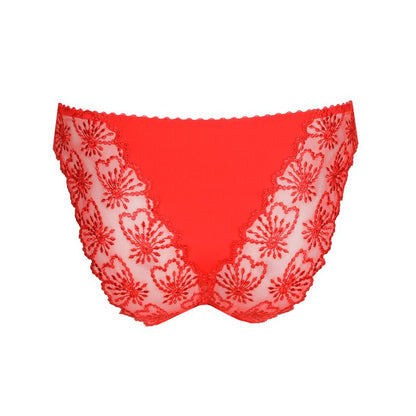 Den fine Jane trusser fra Marie Jo finder du nu i en varm, rød farve. Trussen er lavet med glat mikrofiber foran og bagpå. De skrå kanter er i flot mesh med de fineste blonder. Modellen er skåret højere på benet end en taitrusse. Den viser altså lidt mere af ballen. Det skrå snit er samtidigt med til at give en slankende effekt. Sæt den smukke Jane bh til, så du får et lækkert lingerisæt. Du kan også fint vælge en ekstra trusse fra Jane serien, hvis du godt kan lide at have lidt variation i, hvilken trusse du har på.