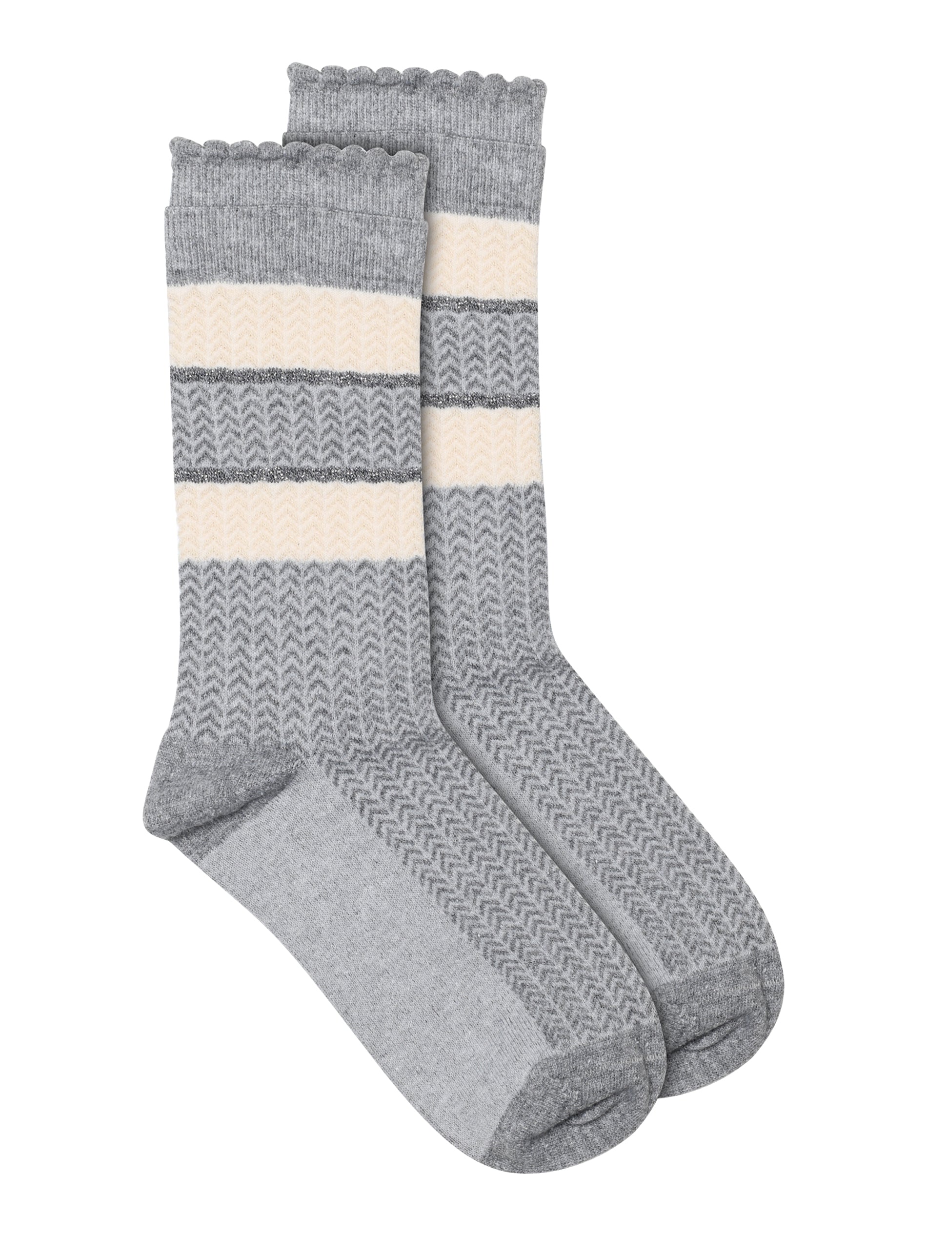 Lækre lysegrå ankelstrømper fra Gustav. Strømperne har brede, hvide striber og smalle lurex detaljer. Ved kanten er strømpen bukket ned, så du får et cool look. Det ser virkelig fint ud, hvis du bruger strømperne i et par loafers.