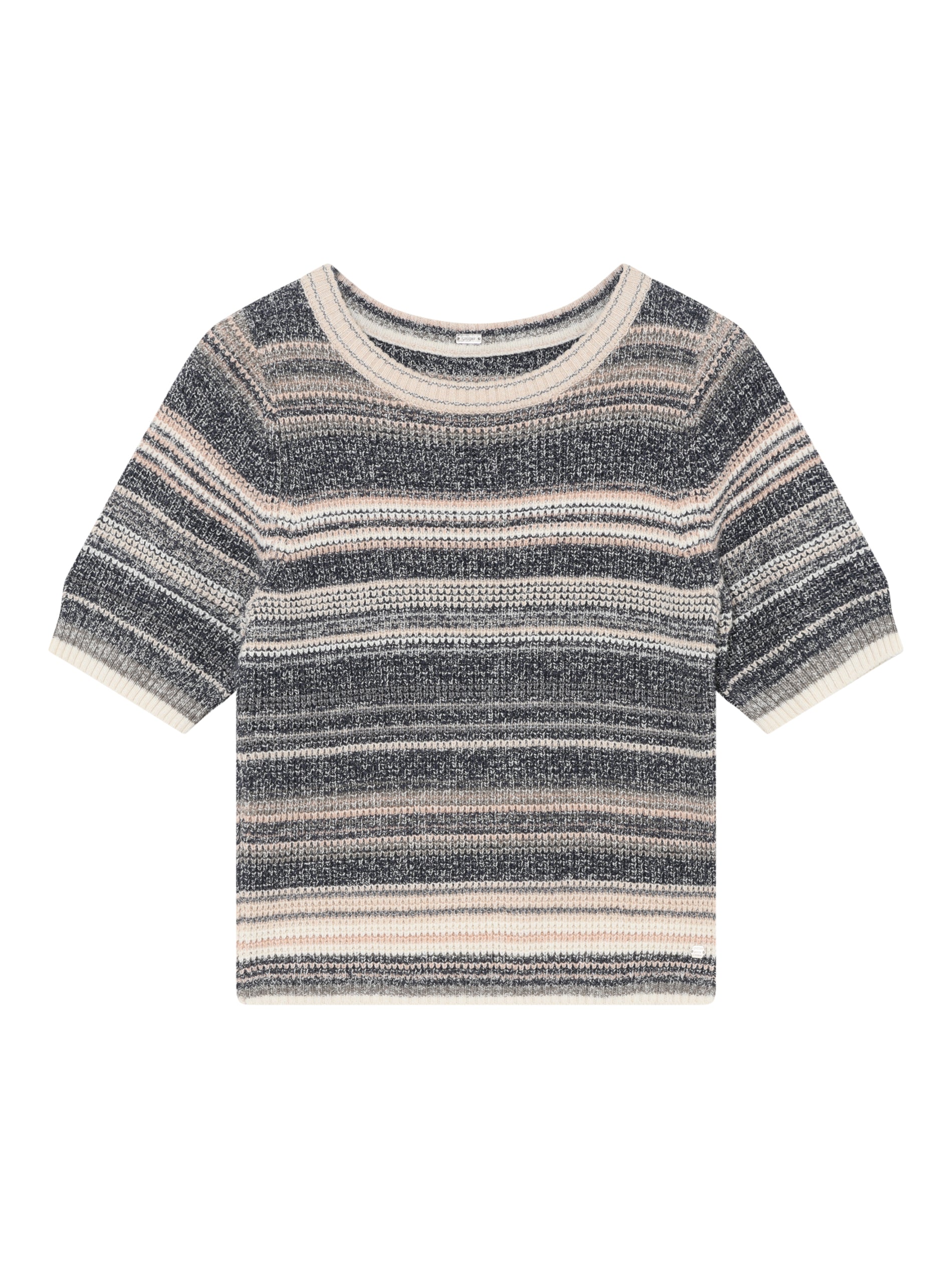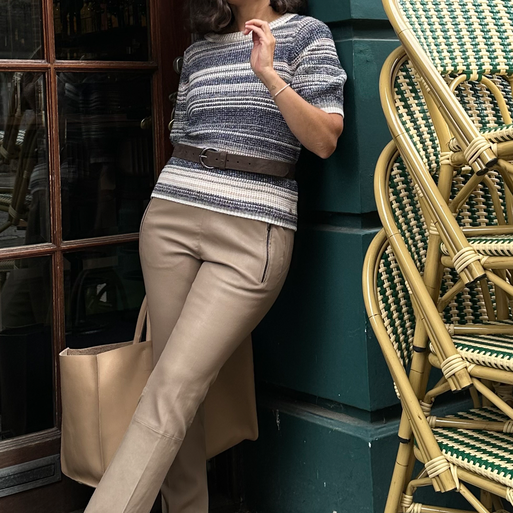 Den gode Shanne strik fra Gustav er stribet i blå og lyse toner. Ærmerne er korte og afsluttet med ribkant, så de sidder flot ind til armen. De smalle lurex striber giver strikken et elegant look. Style til lyse skindbukser, som du ser på billedet. Strikken er også flot til et par jeans eller mørkeblå bukser.