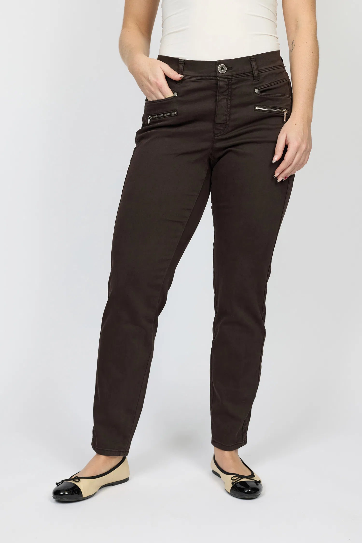 Lækker Rany buks fra 2-Biz i efterårets lækre, mørkebrune farve. Rany buksen er højtaljet og har fine lynlås detaljer ved lommerne. Buksen sidder til og går ind ved anklerne. Den gode stræk sikrer, at Rany er super blød og behagelig at have på. Style med den flotte Birka skjorte, hvis du gerne vil have et lækkert 2-Biz sæt.