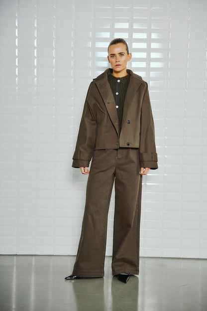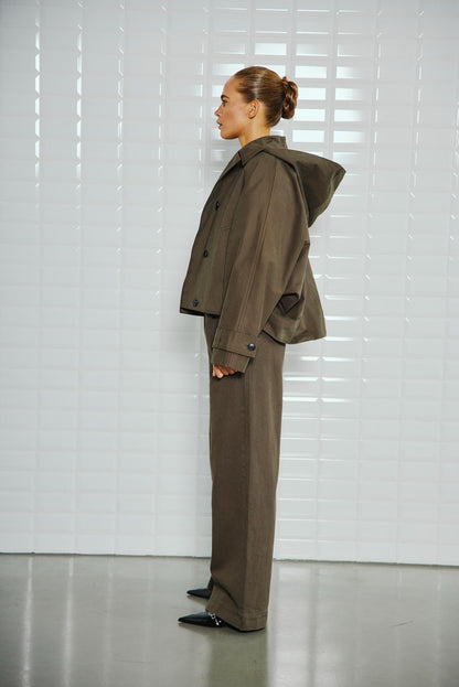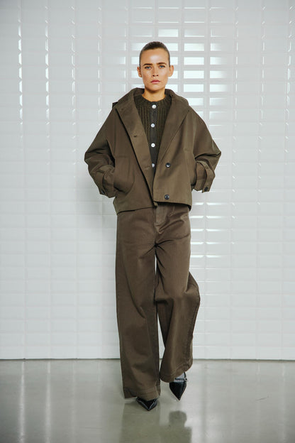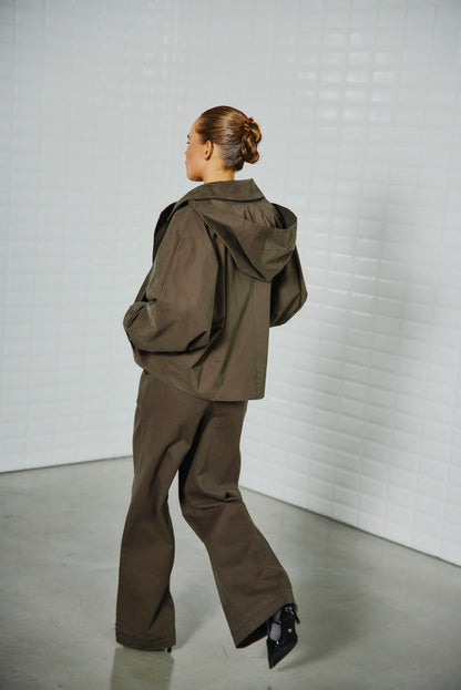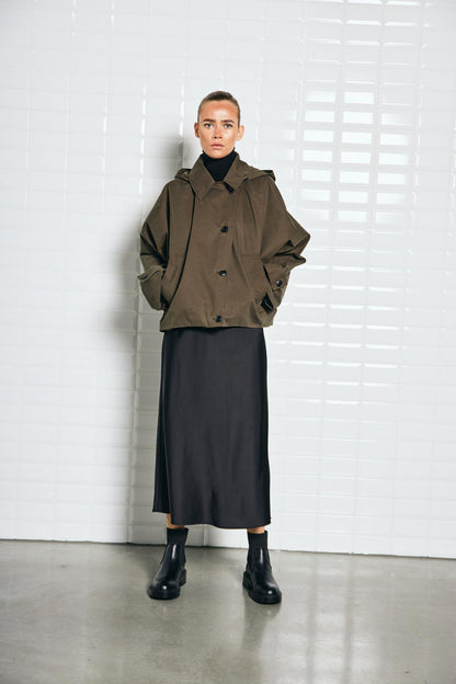 Super fed jakke fra WithBlack i army grøn. Jakken er cropped og har et oversize look. De store ærmer og det voluminøse design får jakken til at se stor ud - det er netop meningen. Den lille hætte kan hægtes af og på, så du selv styrer, om den skal være der. Jakken lukkes med knapper, og så er der lommer i siderne. Modellen har str. xs på.BEMÆRK: Jakken er MEGET stor i størrelsen