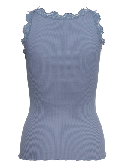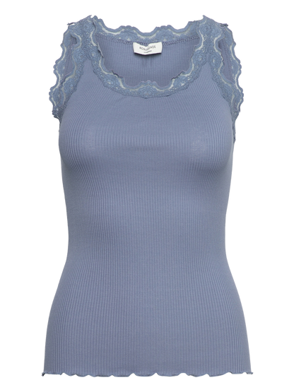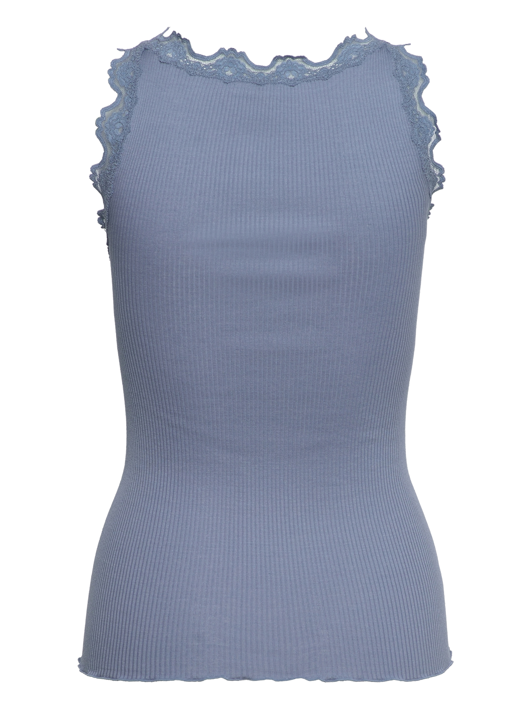 Rosemundes populære blondetop er kommet i en flot, isblå farve. Toppen er lavet i en eksklusiv blanding af silke og bomuld, der gør den åndbar og lækker at have på. Der er ingen sømme, der kan generere i siderne og den gode elasticitet gør den til en klar favorit. Den flotte blondekant ses i halsudskæringen og ved ærmegab og giver det der fine Rosemunde look. Style den lyseblå top til dine jeans eller til shorts og nederdele her i sensommeren. Når efteråret rammer os er toppen rigtig god under en strik eller blazer.