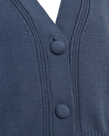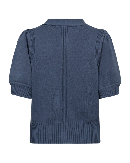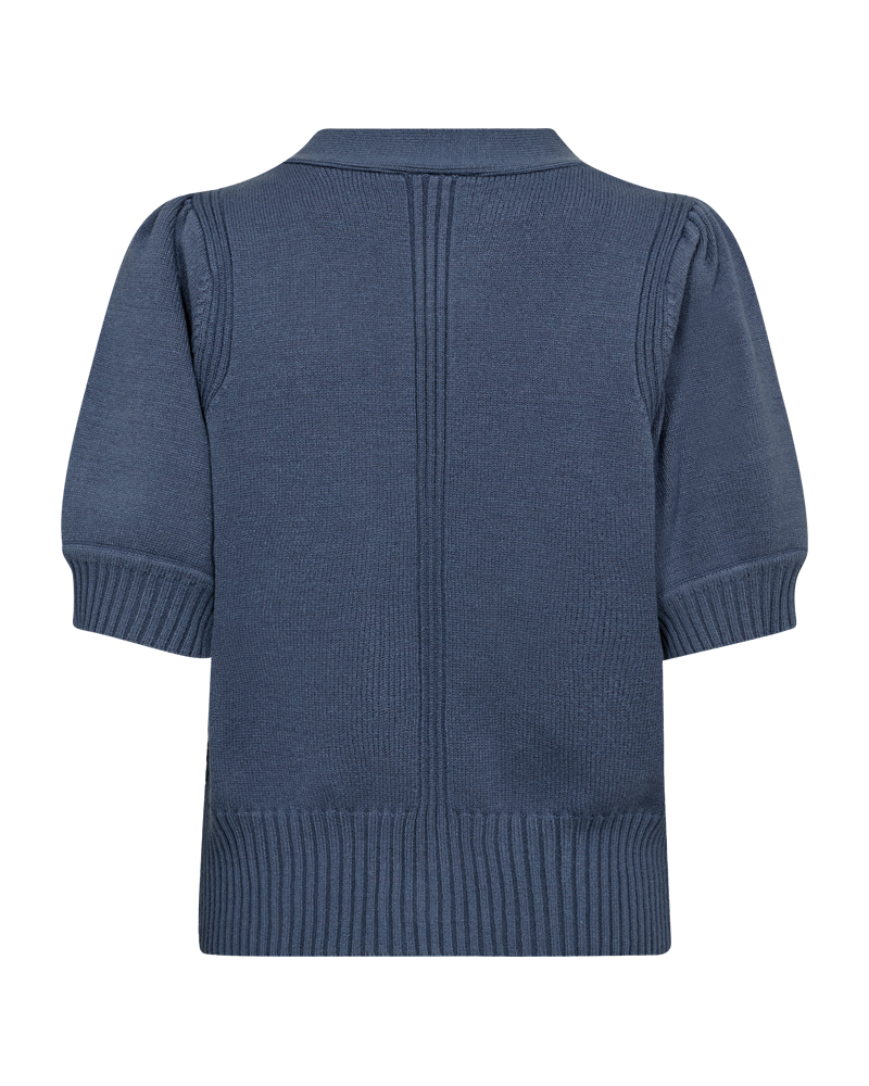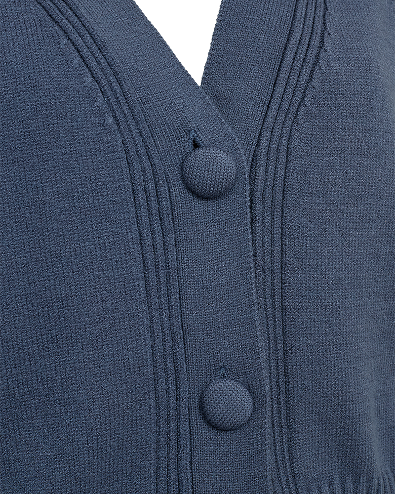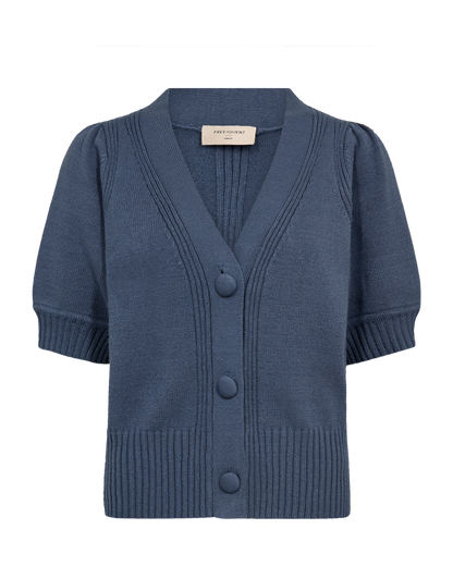 Skøn cardigan fra Freequent med fine pufærmer og store knapper. Den brede ribkant i bunden sikrer en flot pasform. En virkelig fin cardigan til dine jeans eller denim shorts. Den blå farve er også flot til dine hvide bukser her i det sidste af sommeren.