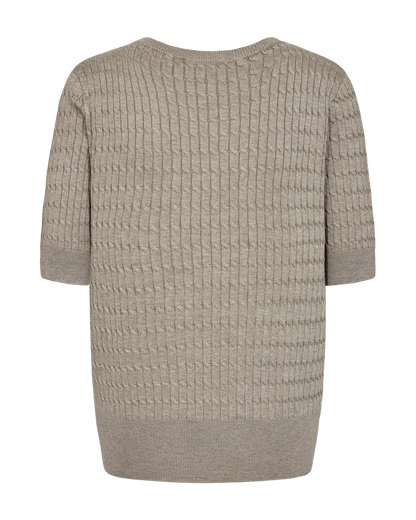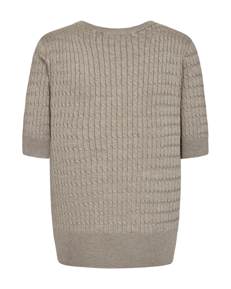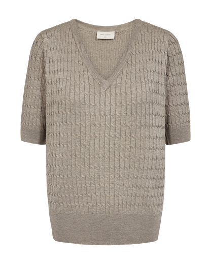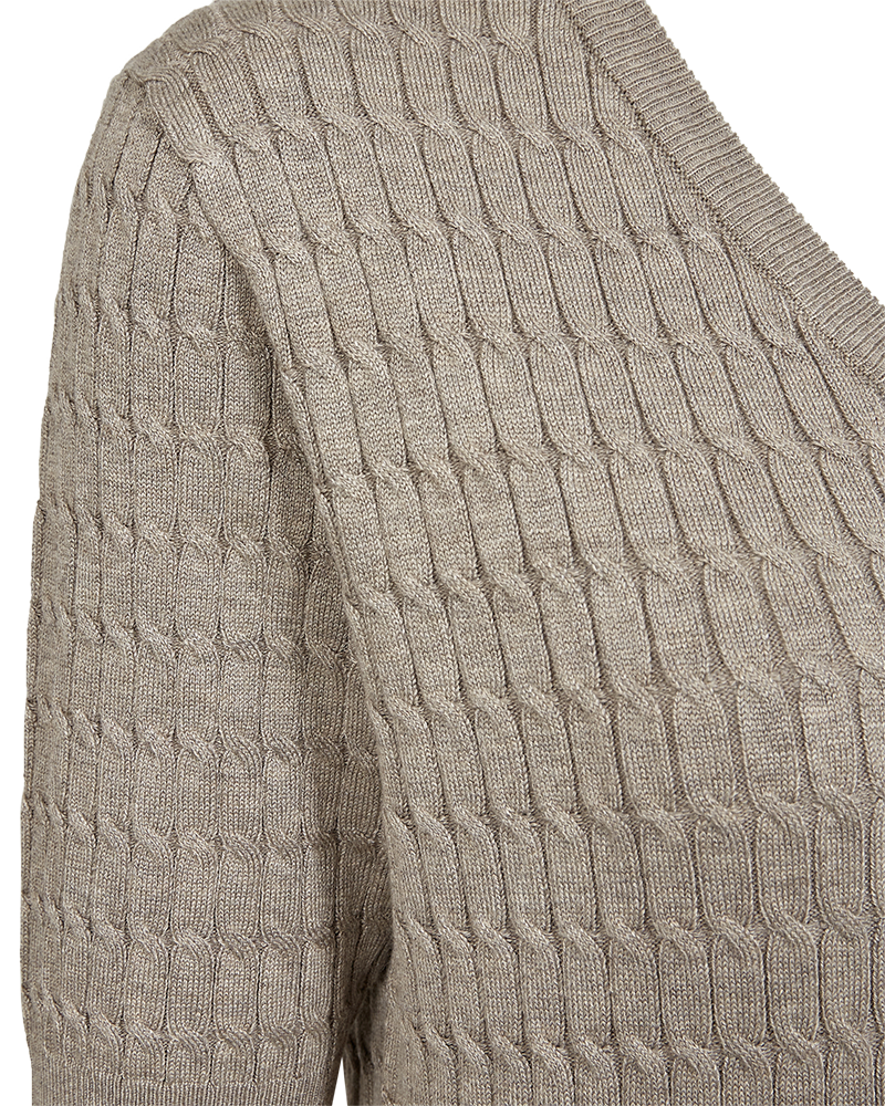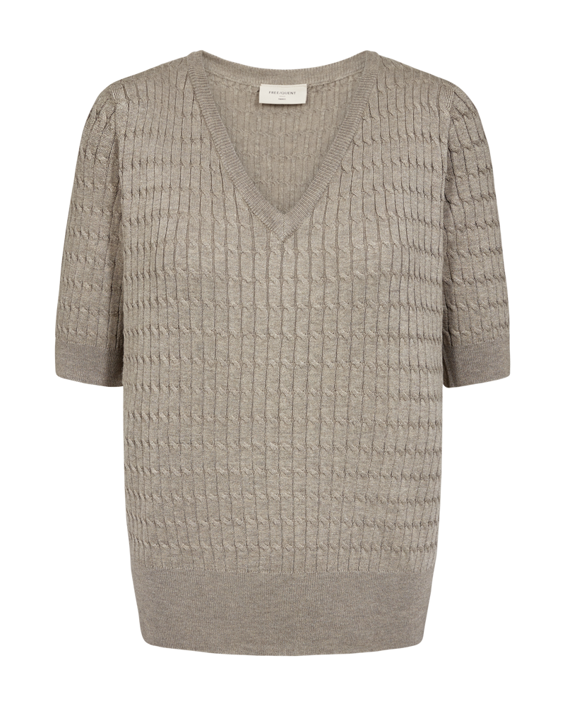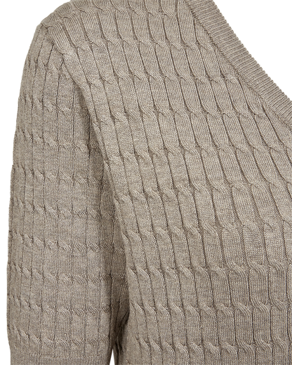 Sandfarvet strik fra Freequent med v-udskæring og fint kabelmønster. Kanterne er lavet i blød rib, så du får en flot afslutning på blusen. Den lækre farve er flot til et par mørkeblå bukser.