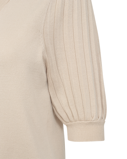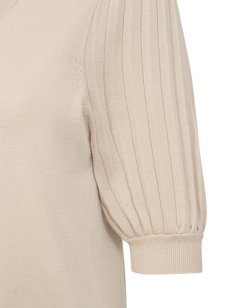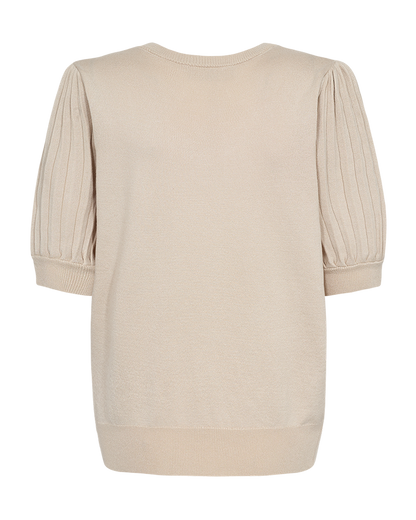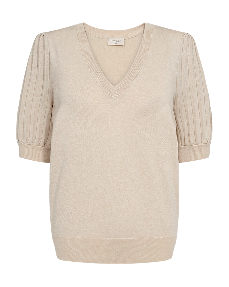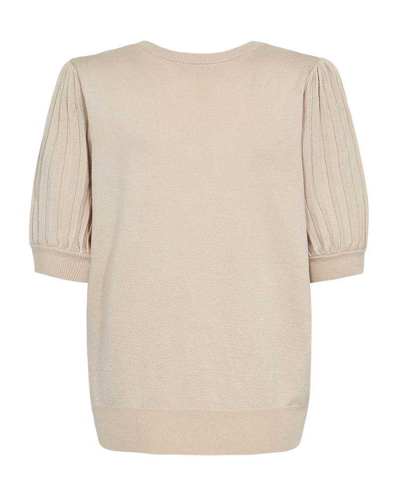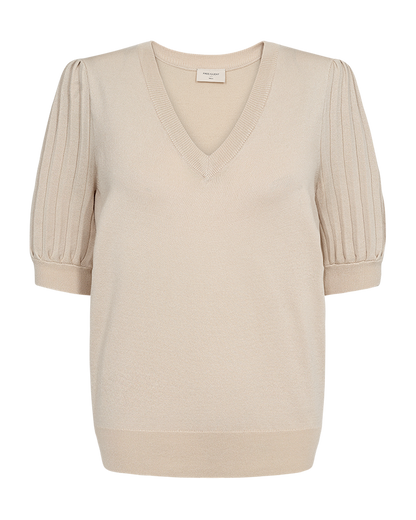 Lækker Freequent strik med korte pufærmer. Den lyse beige går rigtigt godt til sæsonens populære farver som mørkeblå, brun og bordeaux. Ærmerne har fået lidt struktur, som lige bryder det enkle look. Kanterne er afsluttet med rib, så du blusen får en flot pasform.