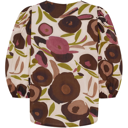 Skøn bomulds bluse fra Marta du Château med print i retro look. De brune, grønne og rosa toner har en fed 70'er vibe. Perfekt stylet med de fine Kiana bukser i mørkebrun babyfløjl.