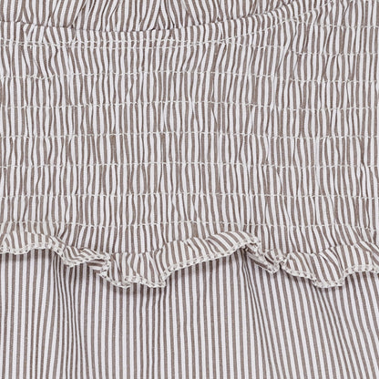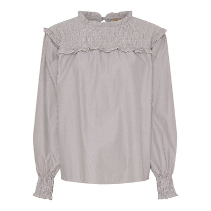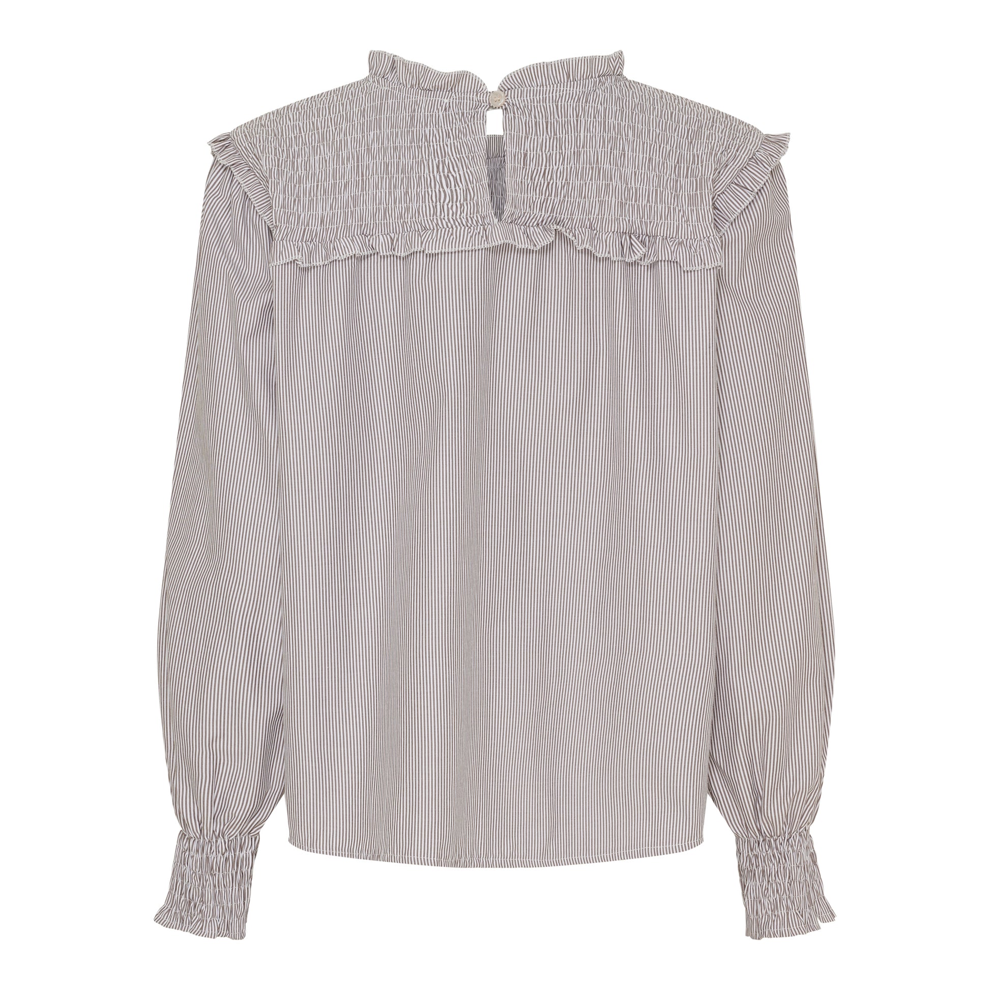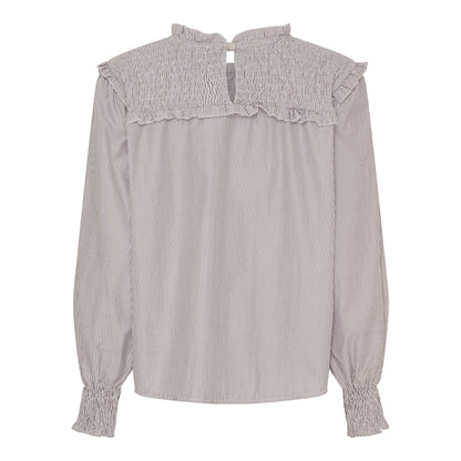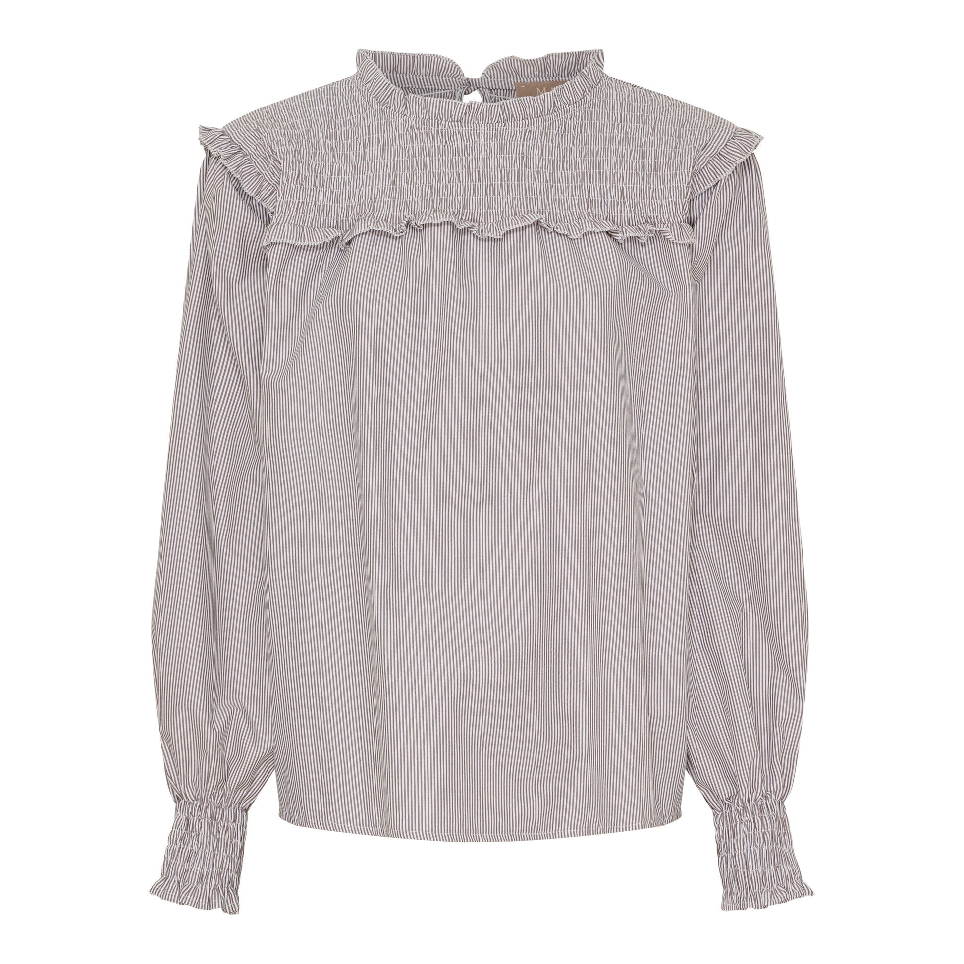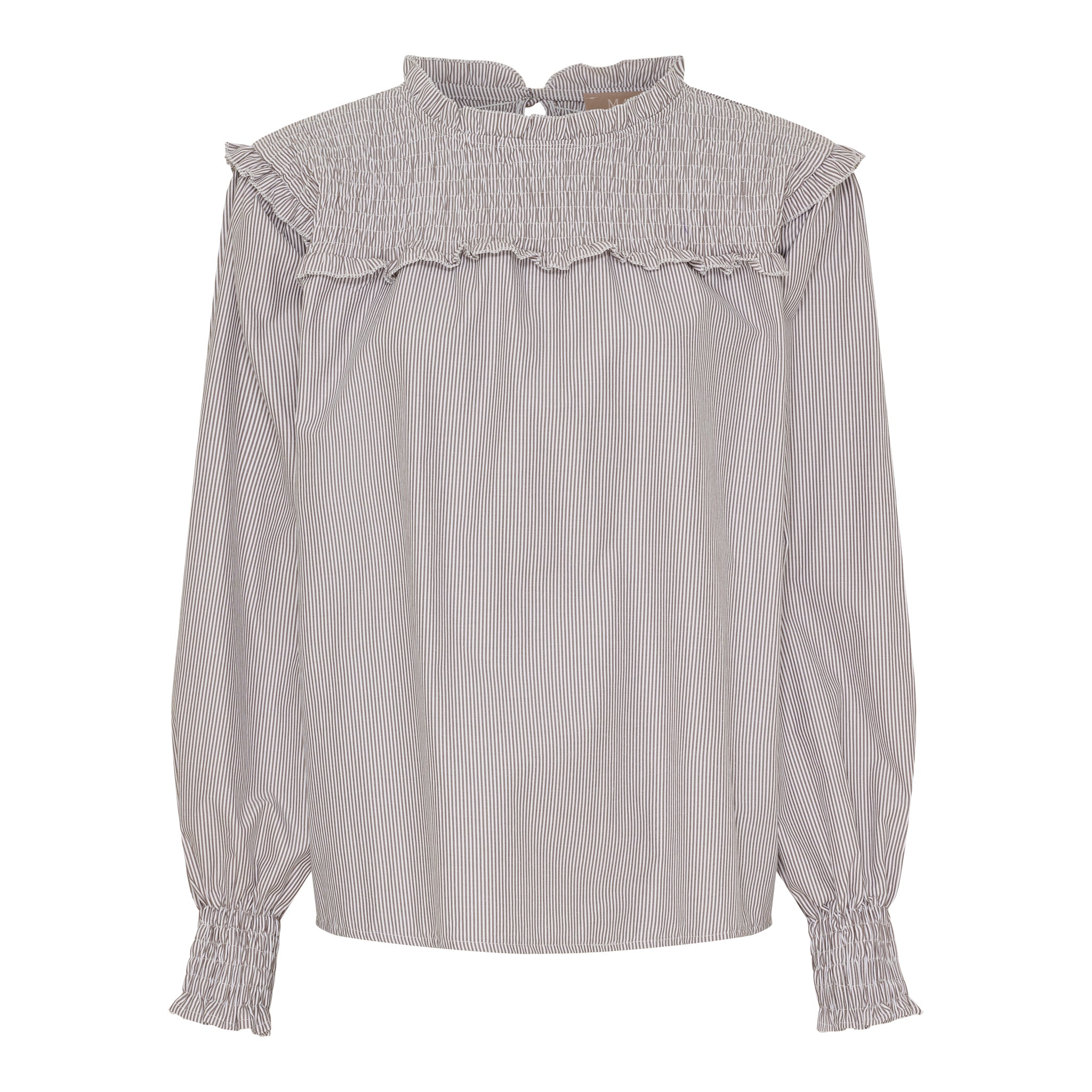 Super sød bluse fra Marta du Château i bomuld og polyester. De fine smock detaljer øverst og ved ærmerne giver blusen et feminint look. Du lukker blusen i nakken med en lille knap. skøn til et par jeans eller til lyse bukser her i sommeren. Blusen er brun og hvid stribet. Du finder den også i en skøn blå og hvid stribet udgave.
