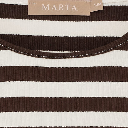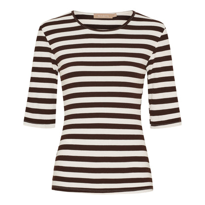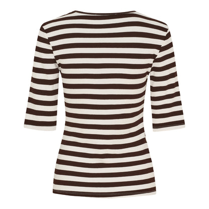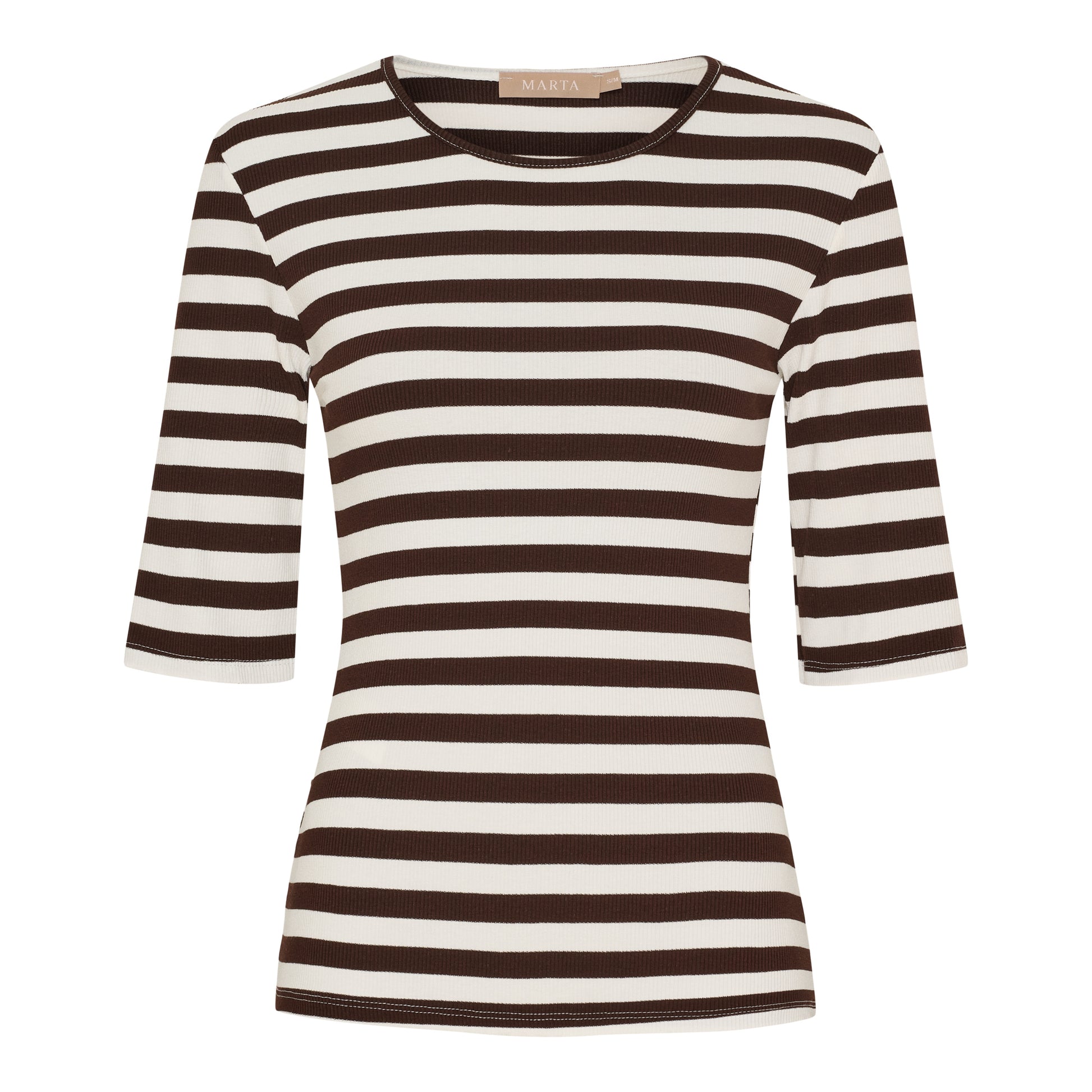 Her får du en skøn, stribet t-shirt fra Marta du Château i blød bomuld. T-shirten har brune og hvide striber og er lavet med 3/4 lange ærmer. Den har en tætsiddende pasform og er flot at style til jeans eller brune bukser.