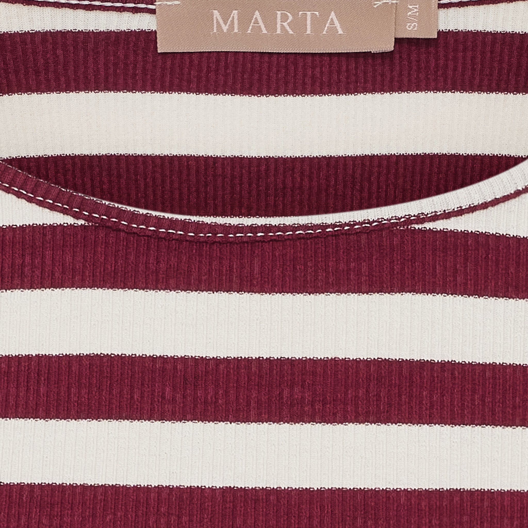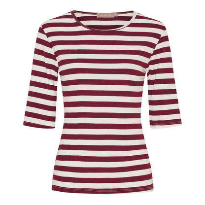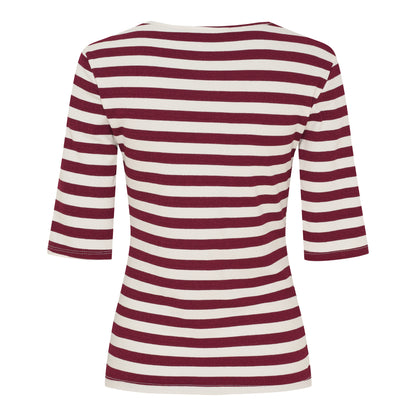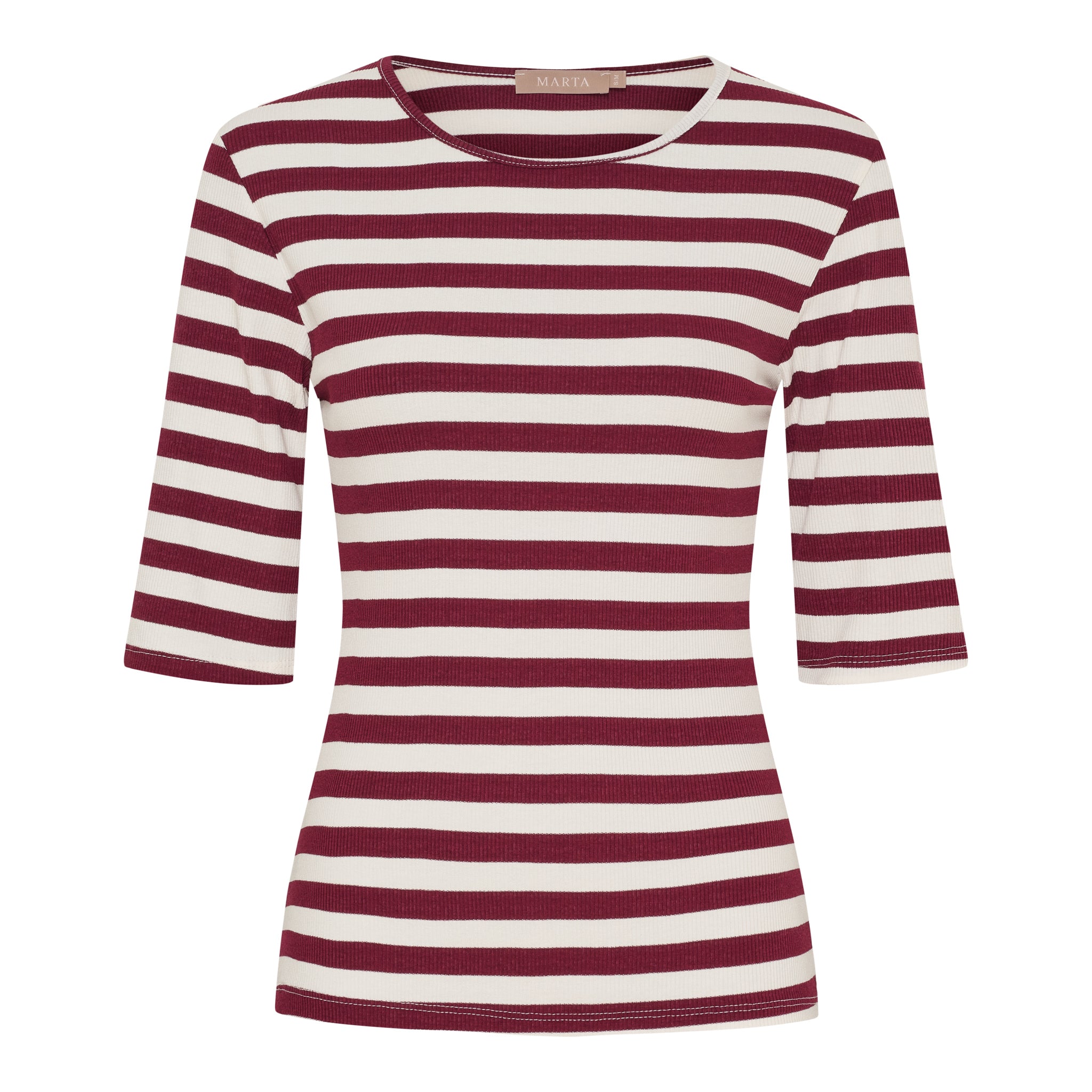 Lækker t-shirt fra Marta du Château med bordeaux og hvide striber. T-shirten er i blød bomuld og har en tætsiddende pasform. Ærmerne er lavet i 3/4 længde så t-shirten passer godt til sensommeren og efteråret.