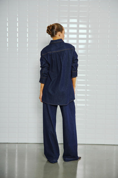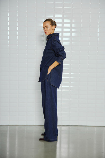 Skøn skjorte fra WithBlack i kraftig denim. Skjorten har store lommer på brystet og en løs pasform, så du snildt kan style en anden skjorte under og lave et cool lag på lag outfit. I overgangsperioden mellem sommer og efterår, kan du også bruge Odette skjorten som en jakke. Knapperne er gyldne, så de giver skjorten et varmt look.