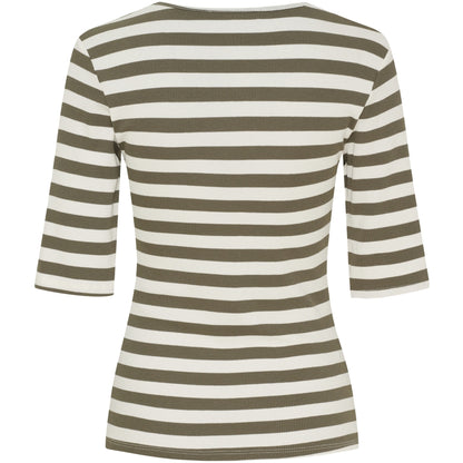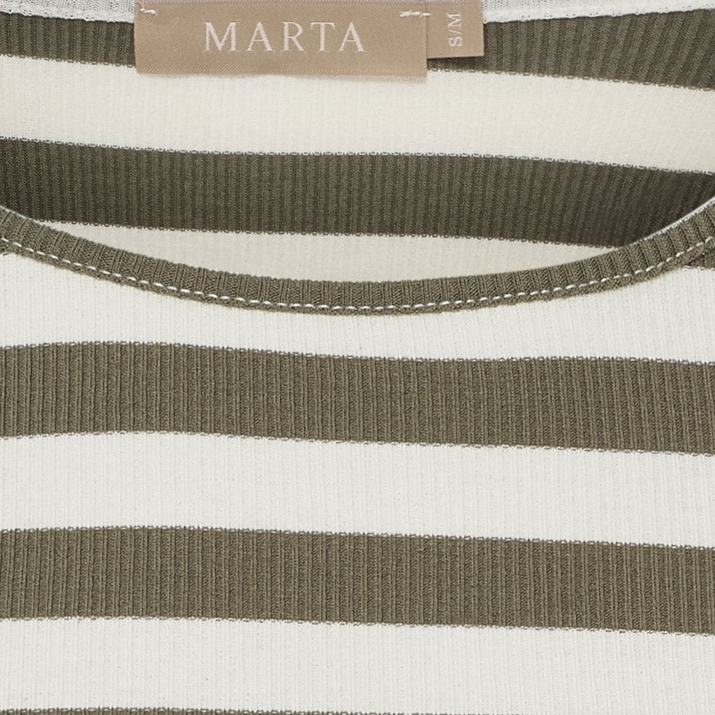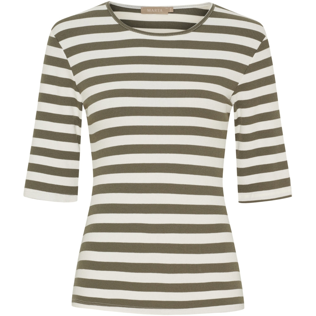 Lækker rib t-shirt fra Marta du Château med grønne og off white striber. T-shirten har rund hals og 3/4 lange ærmer. Pasformen sidder til men på en behagelig måde, da der er godt med stræk i materialet.
