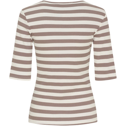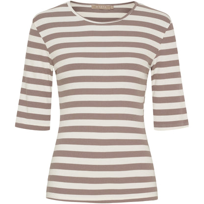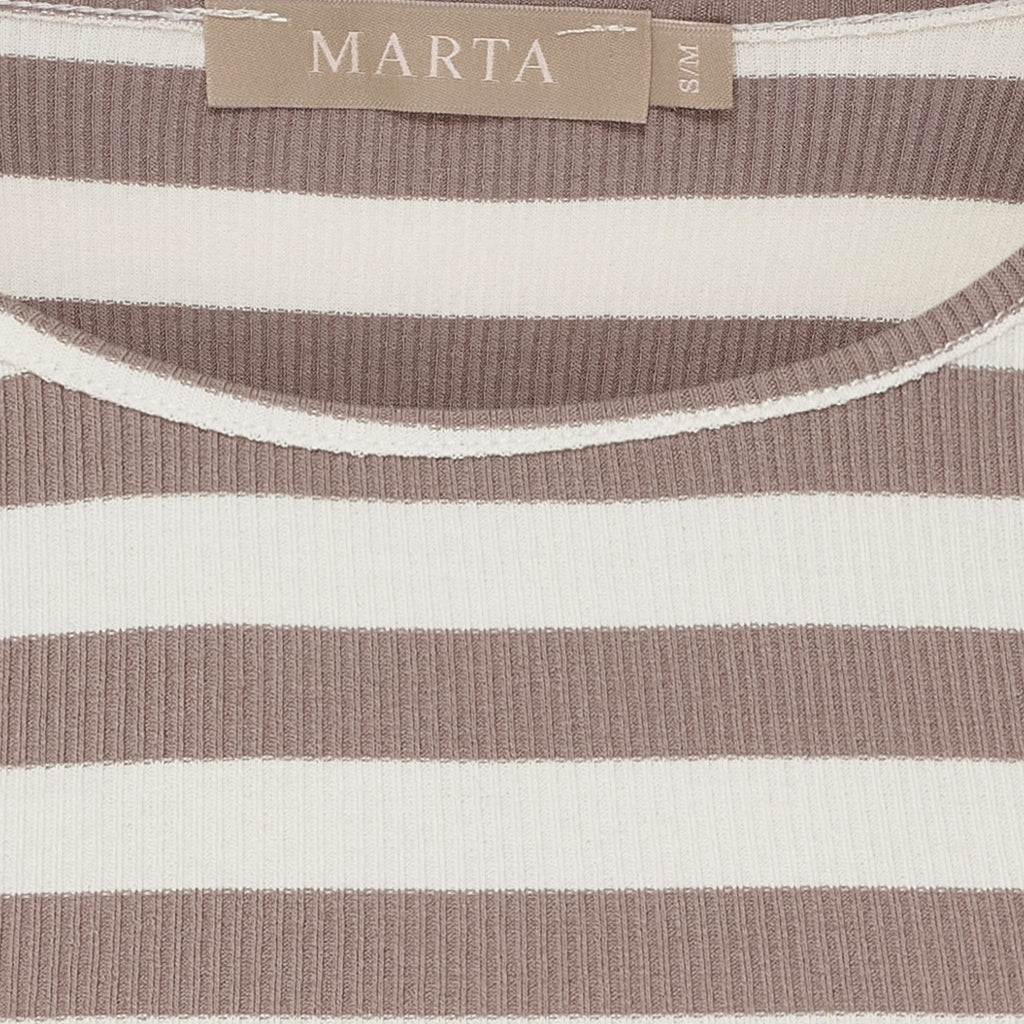 Skøn rib t-shirt fra Marta med lysebrune og off white striber. T-shirten har 3/4 lange ærmer og er super fin til dine jeans eller til et par off white bukser, inden efteråret rigtigt rammer.