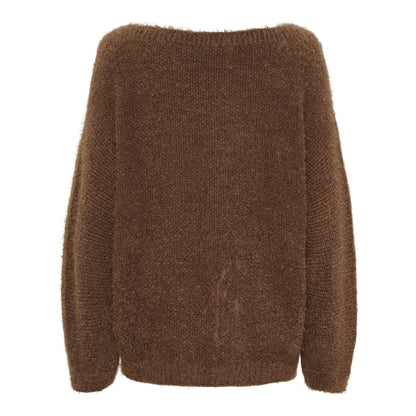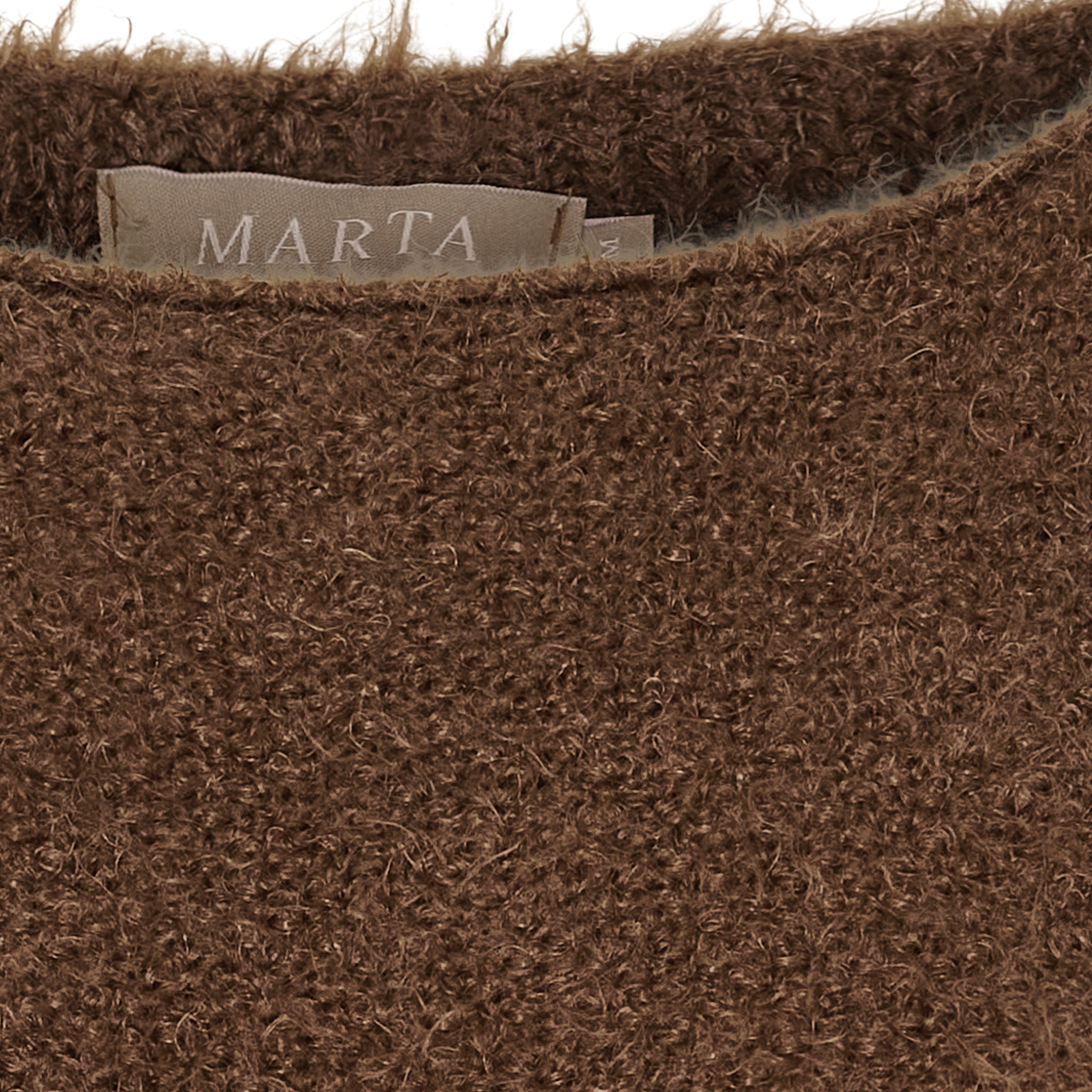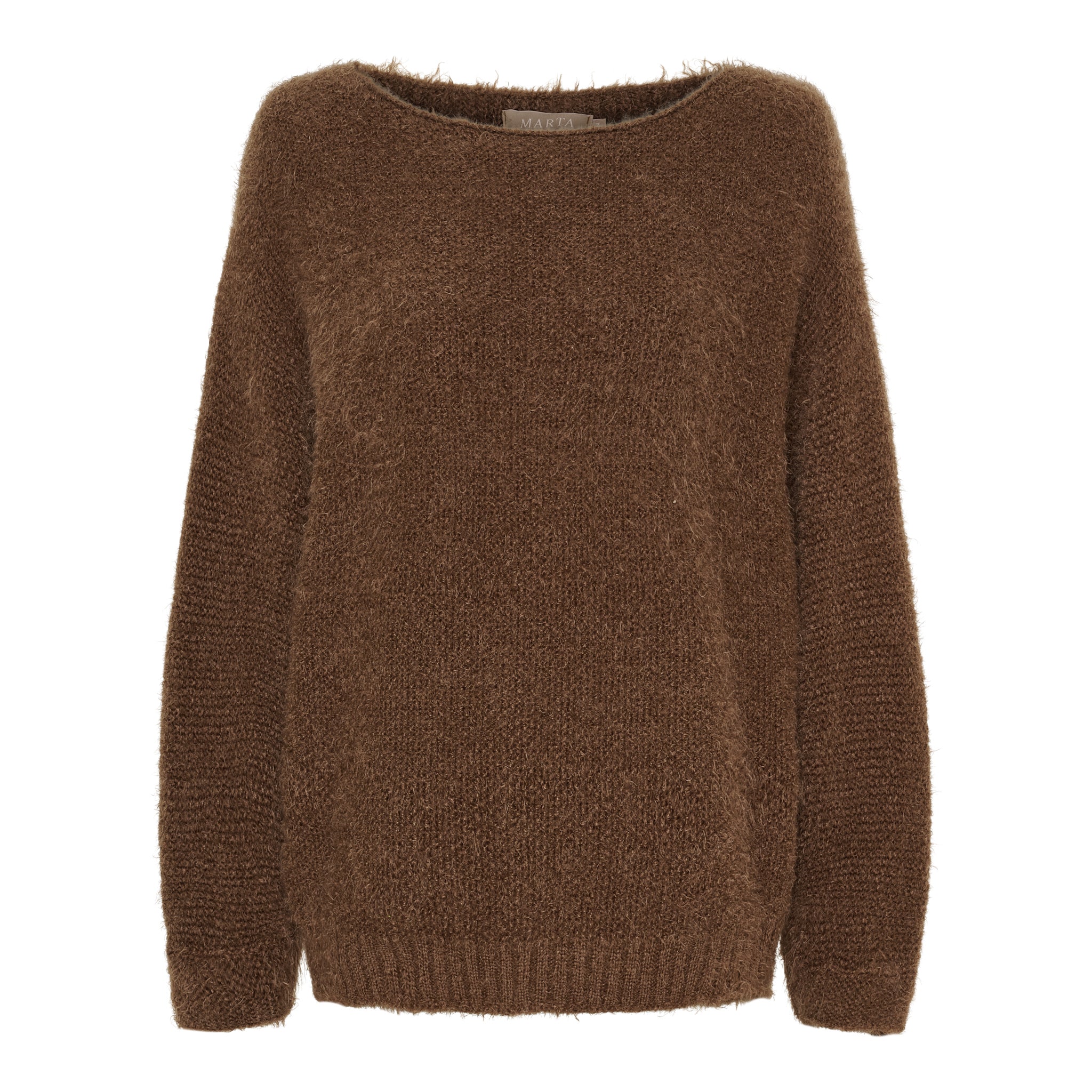 Blød og vamset strik fra Marta du Château i mørkebrun chenille. Strikken har flot bådudskæring og er virkelig fin til alle de skønne bukser til efteråret. Style gerne med en lysere farve, så du rigtigt fremhæver de varme toner i strikken.