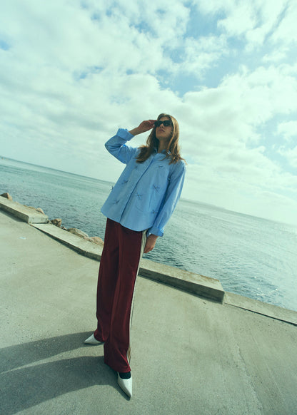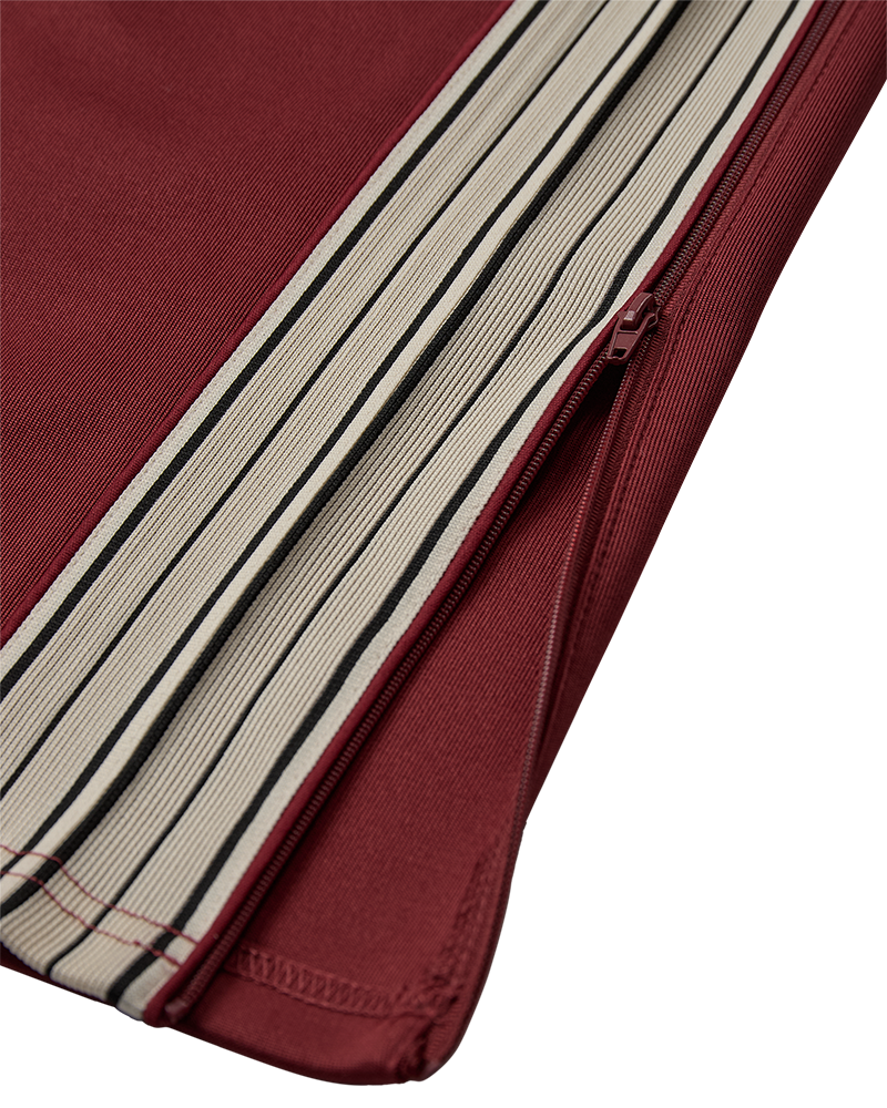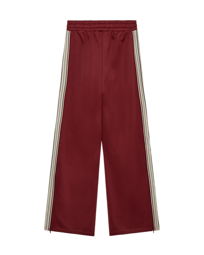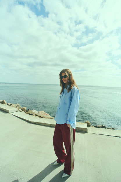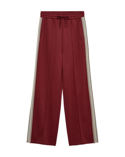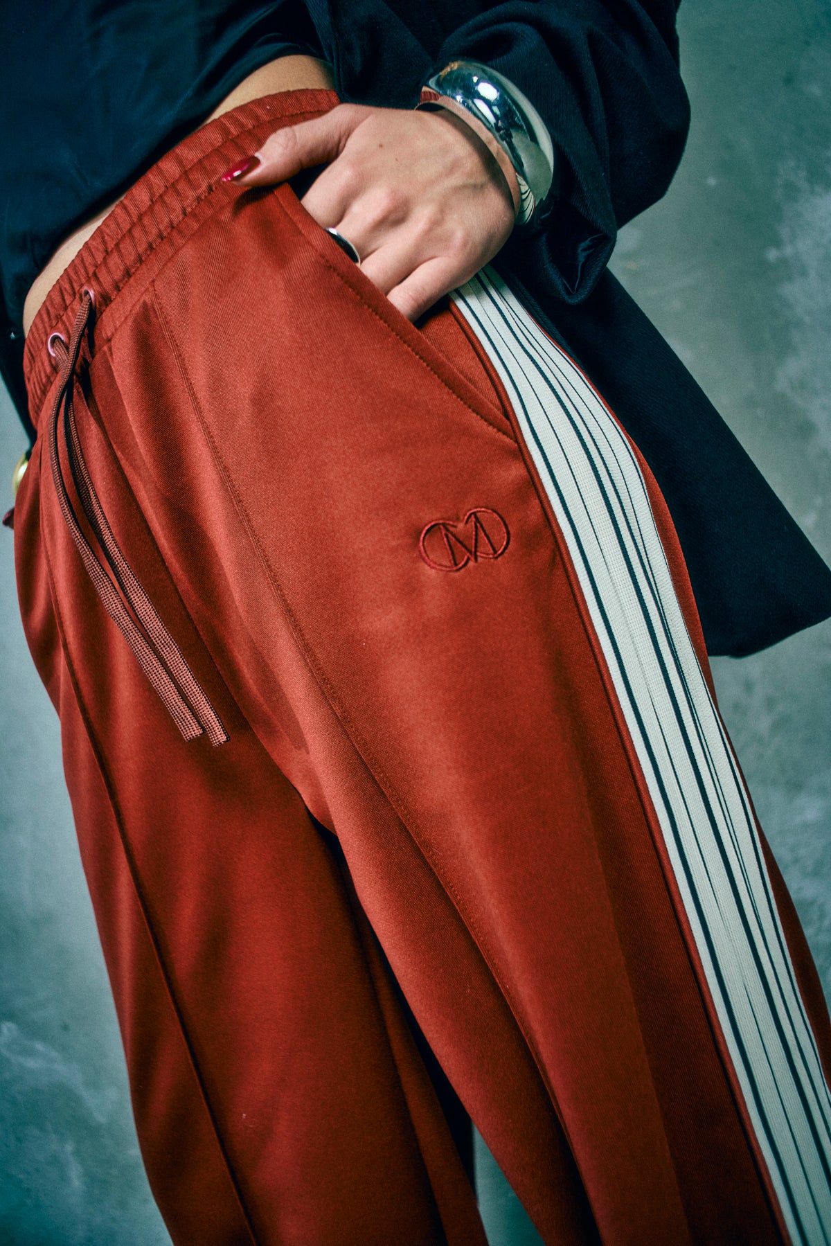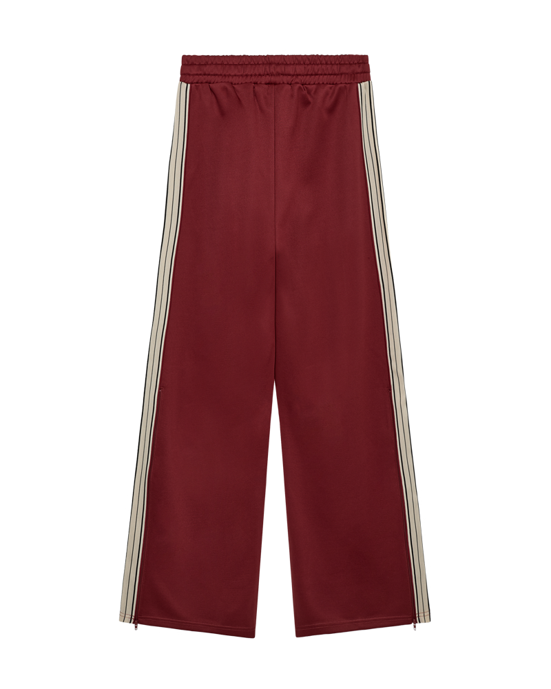Super cool trackpants fra Copenhagen Muse i en lækker, vinrøde farve. Bukserne har en fed gallon ned langs siden i off white med smalle bordeaux striber. Der er lommer i siderne og elastik i linningen. Super fede både til hverdag og fest.