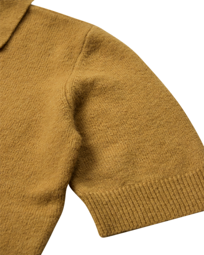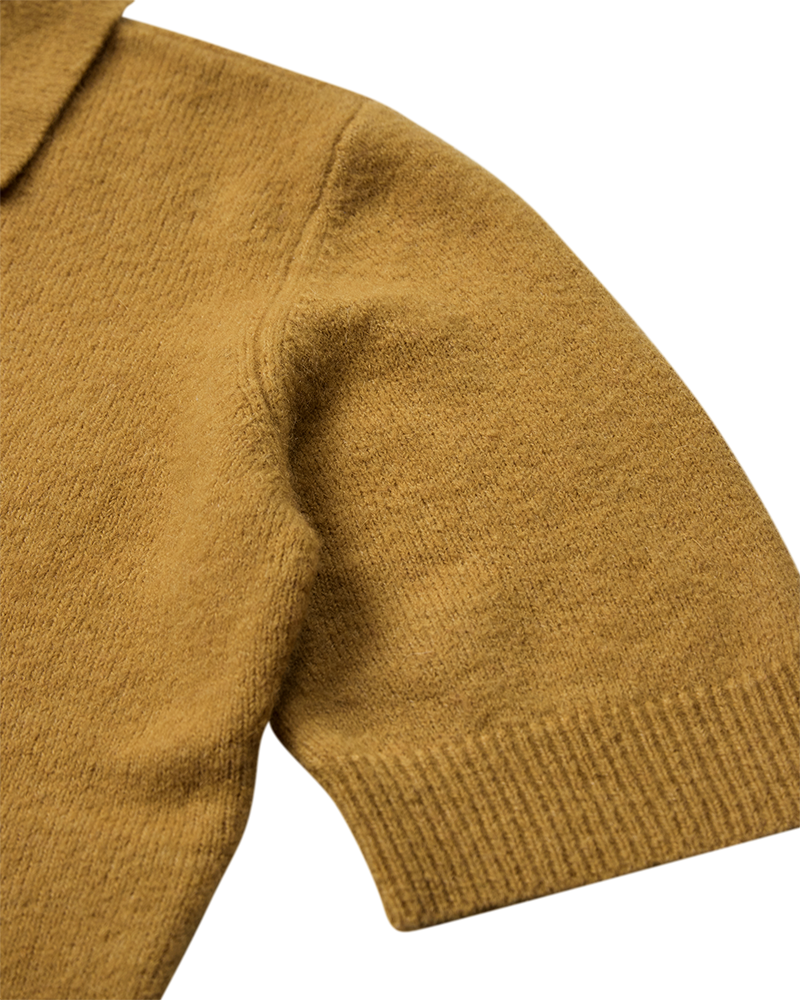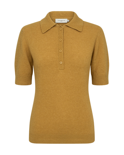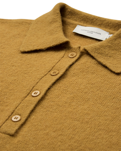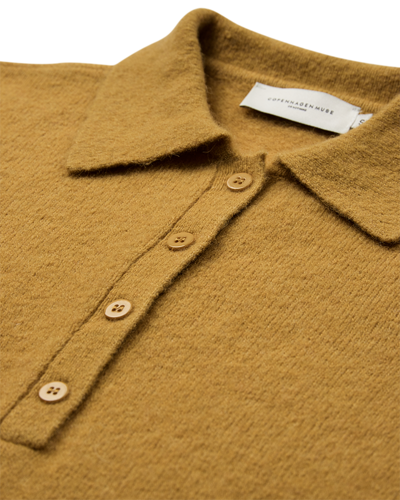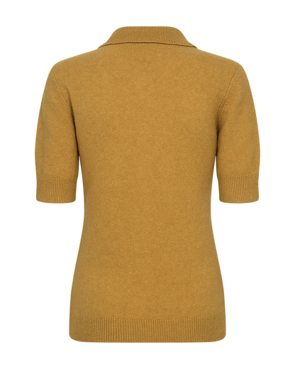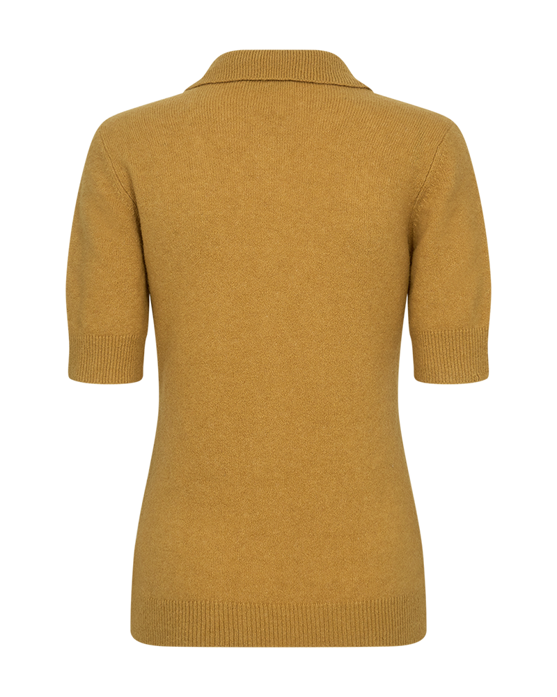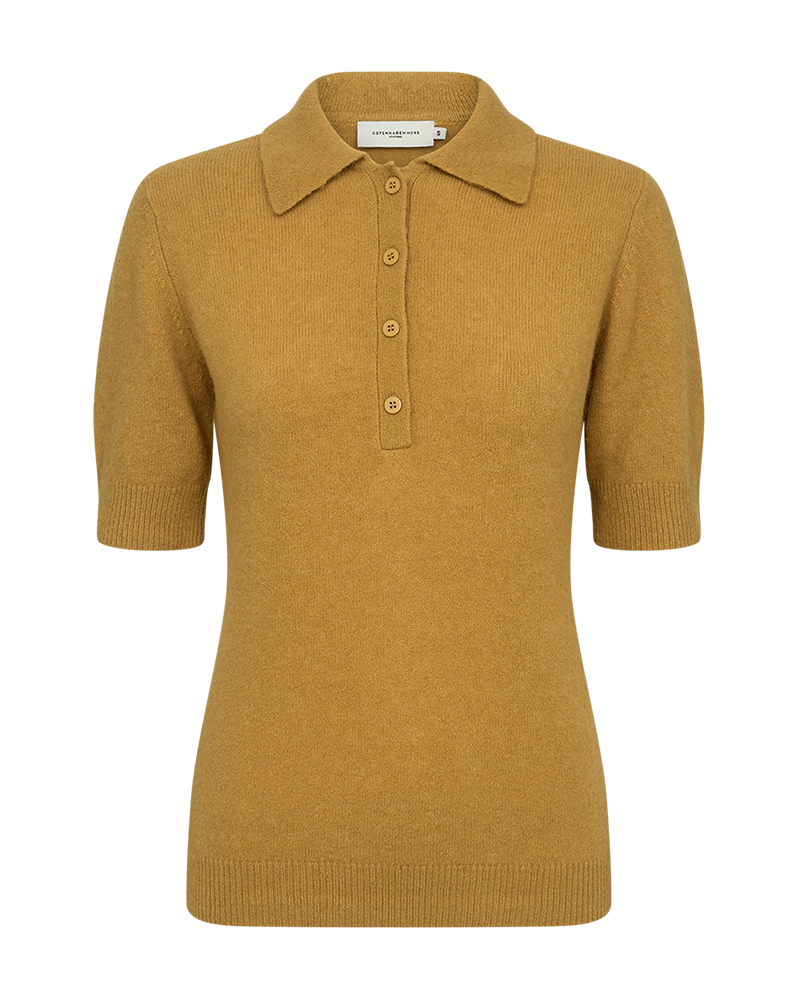 Lækker strik polo fra Copenhagen Muse i en fin sennepsfarve. Blusen har flip krave og korte ærmer. Både bunden og ærmerne har fået en fin ribkant som afslutning. Det gør noget virkelig fint for pasformen. Style den gule bluse til dine grå bukser - det giver en flot effekt med det grå og sennepsgule sammen.