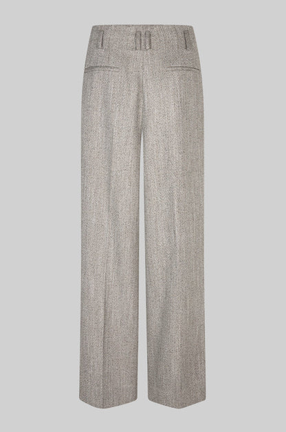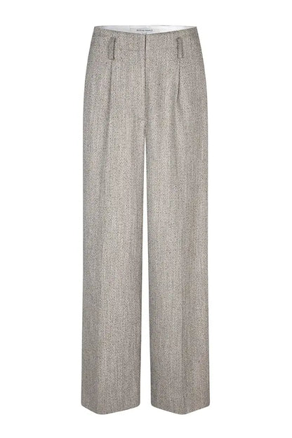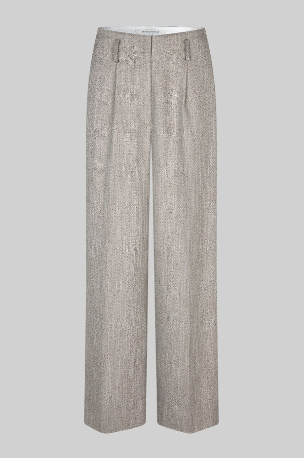 Fede tweed bukser fra Second Female med god vidde i benene. Bukserne har de fineste læg foran og en glat linning uden synlige hægter. Der er bæltestropper i linningen, så du kan style med et lækkert bælte. Bælte trenden kommer vi til at se meget til i efteråret, så kast dig endelig ud i at style dine bukser med et bælte.