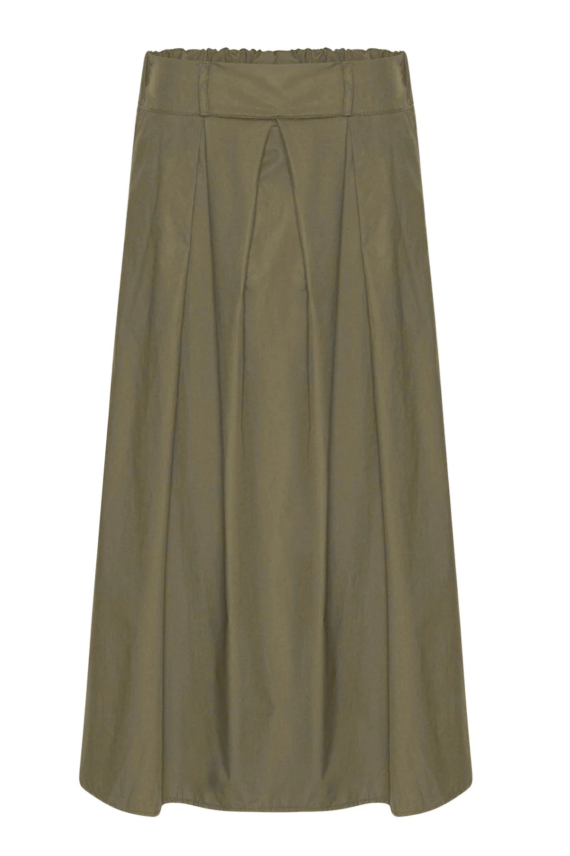 Skøn nederdel fra Amaze Cph i armyfarvet bomuldspoplin. Nederdelen har elastik i linningen bagpå og flotte læg foran, der giver et virkeligt flot fald. Style med en cool t-shirten og en strik, hvis det skal være råt. Når efteråret rigtigt kommer er nederdelen selvfølgelig flot med et par lange støvler.
