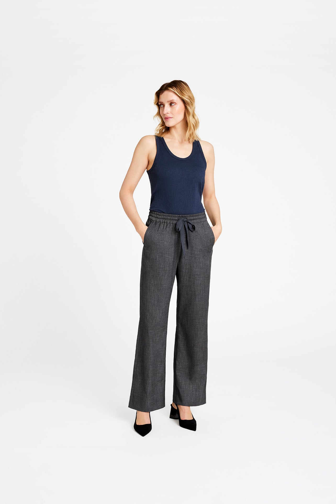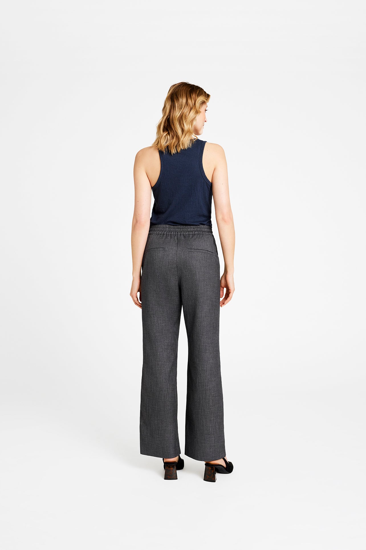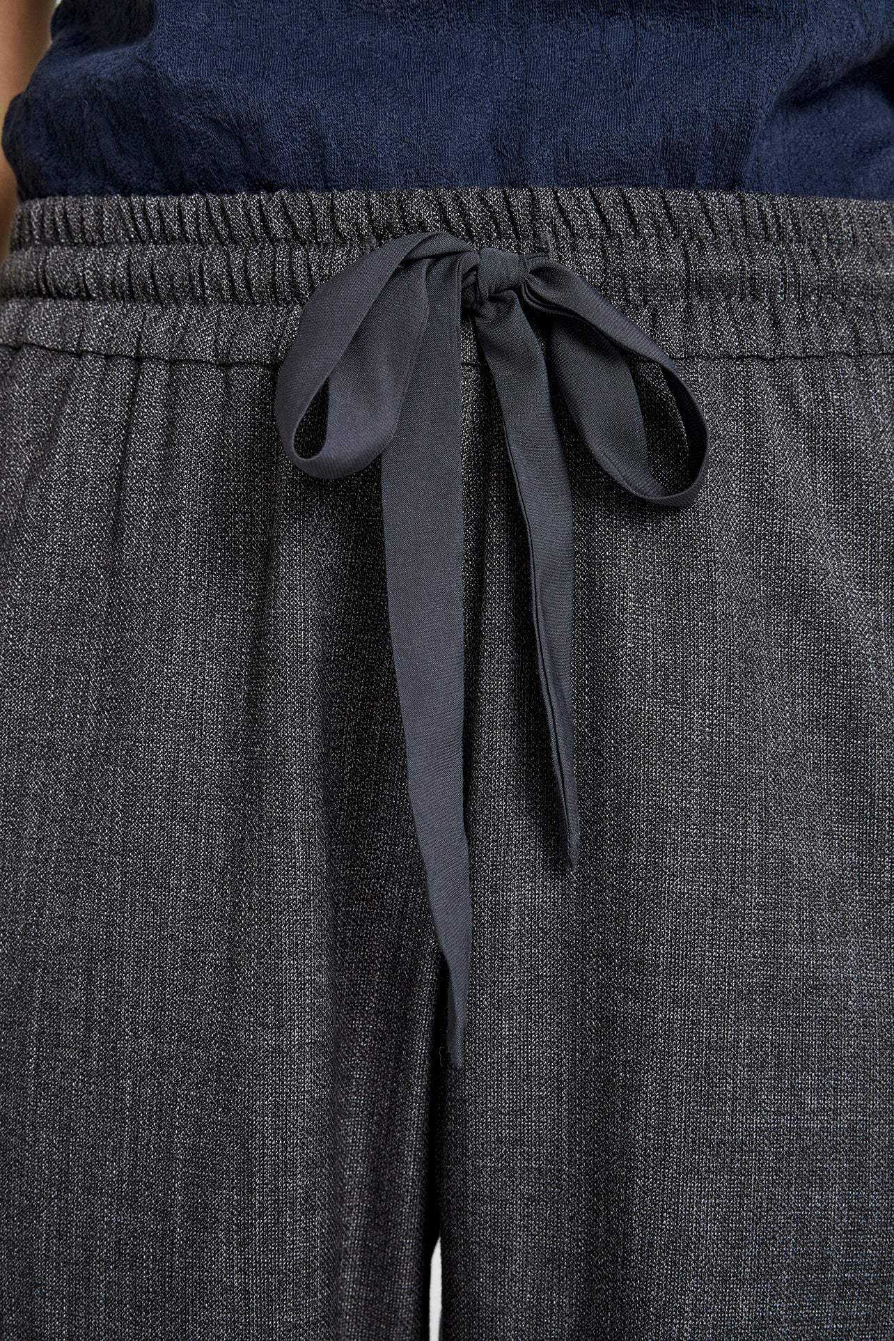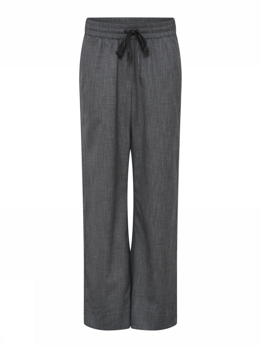 Skønne, mørkegrå bukser fra Gustav med elastik og bindebånd i linningen. Buksen har skrålommer i siderne og lige ben. En fed og lidt sporty buks, der er flot til efteråret.