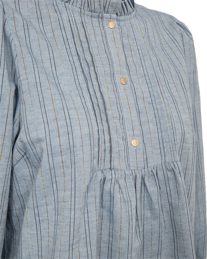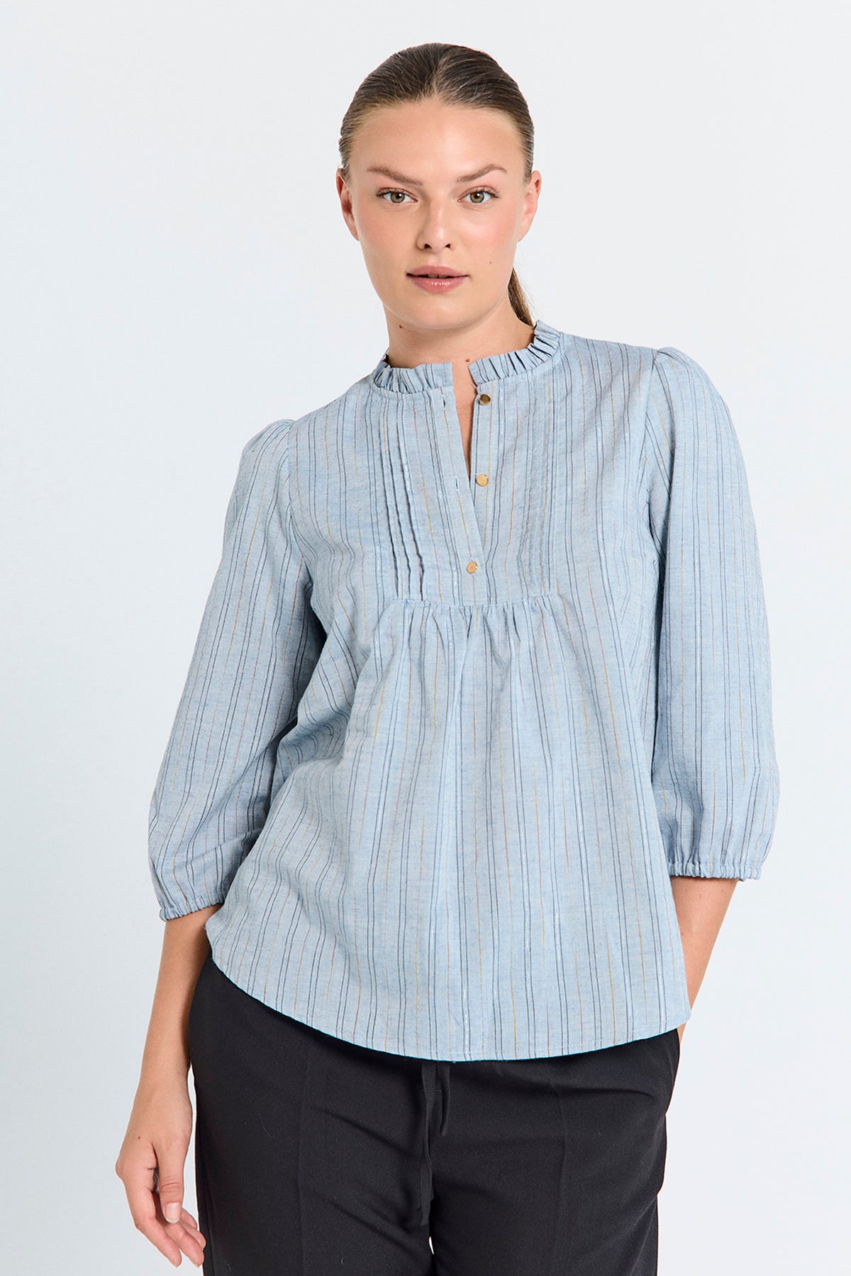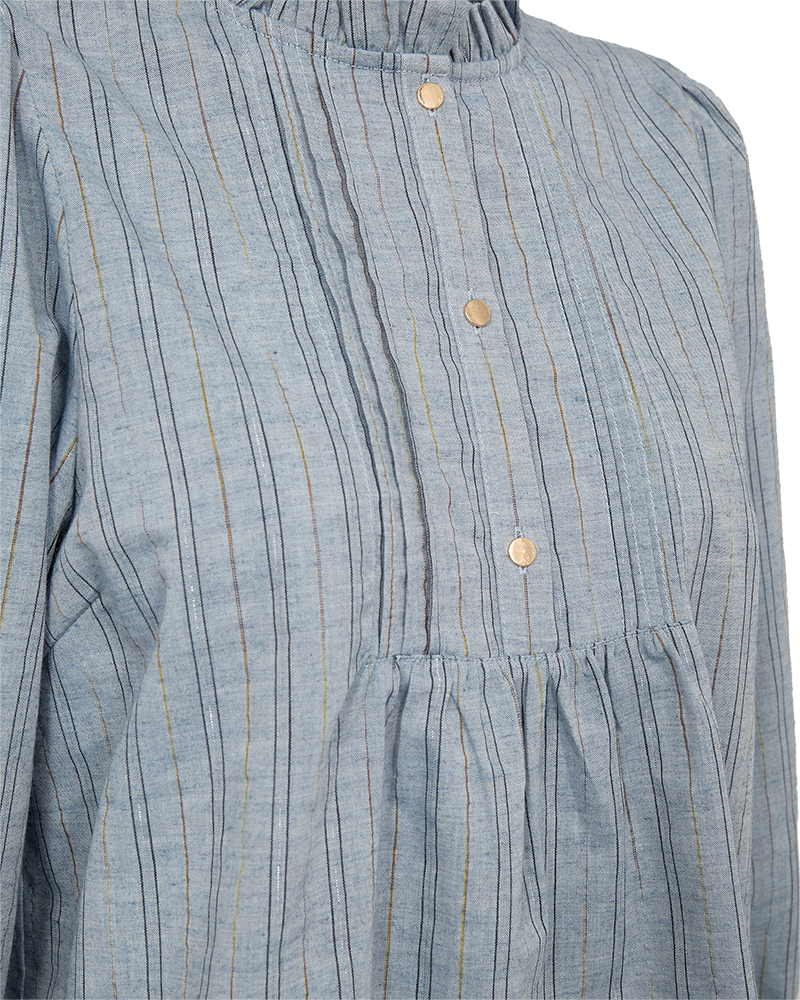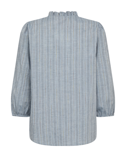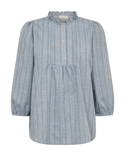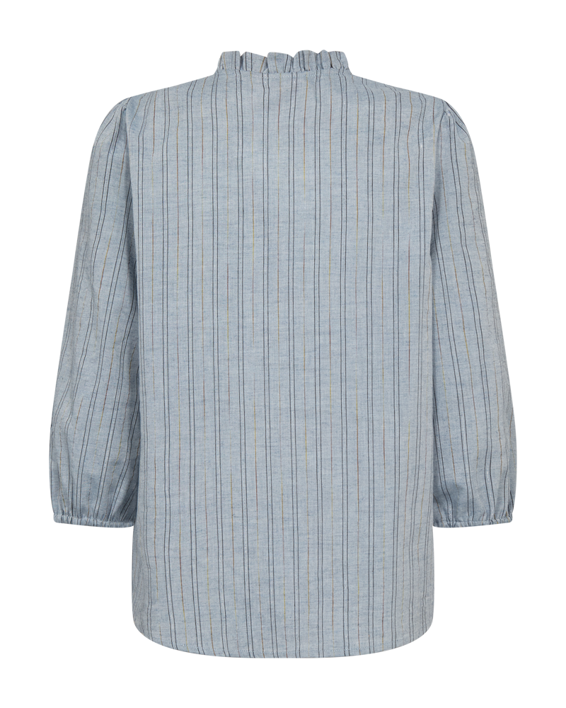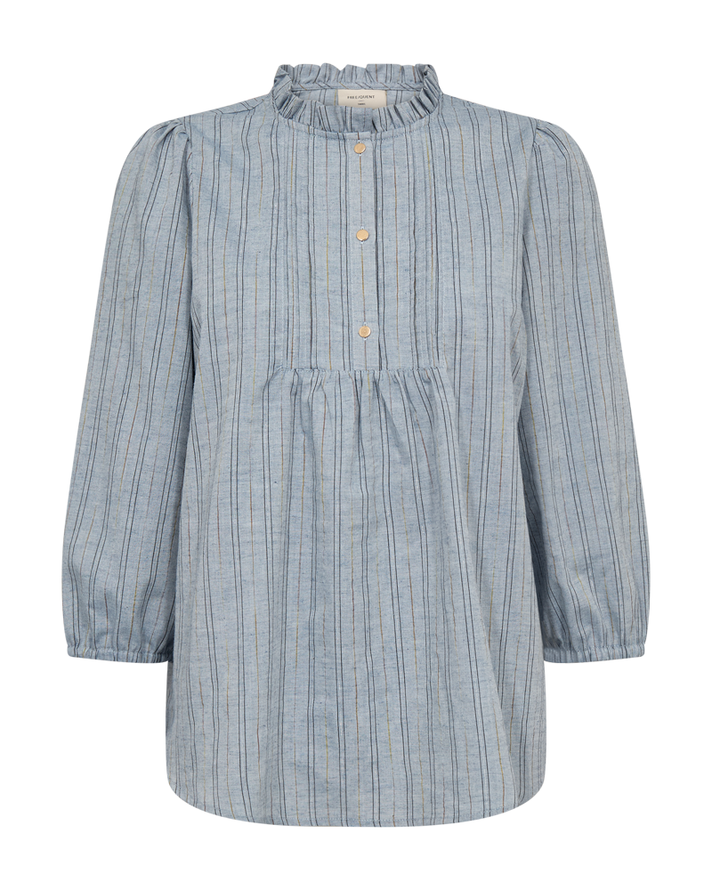Feminin skjortebluse fra Freequent i støvet blå. Skjorten har et fint stykke øverst med læg, og søde flæser ved kinakraven. Super fin til både pæne bukser og jeans.