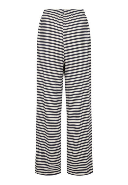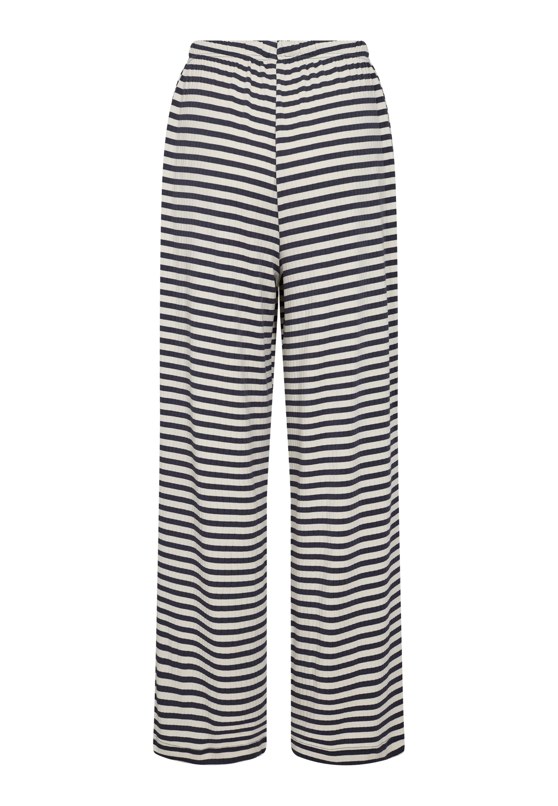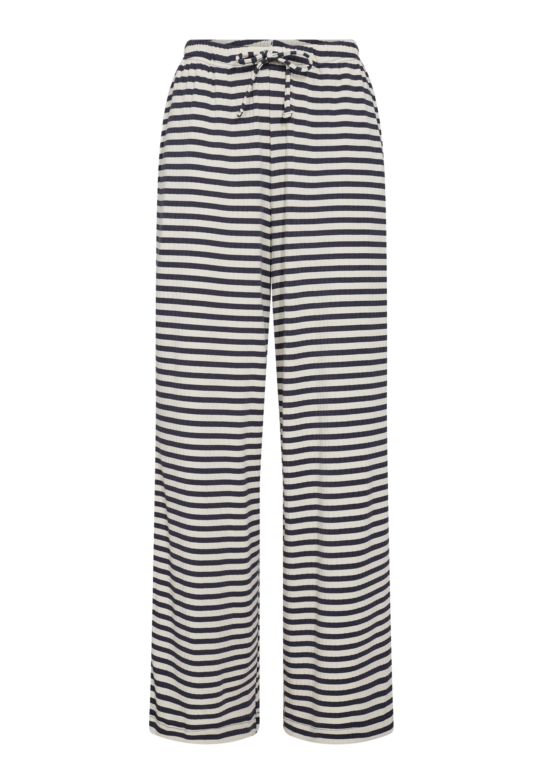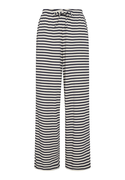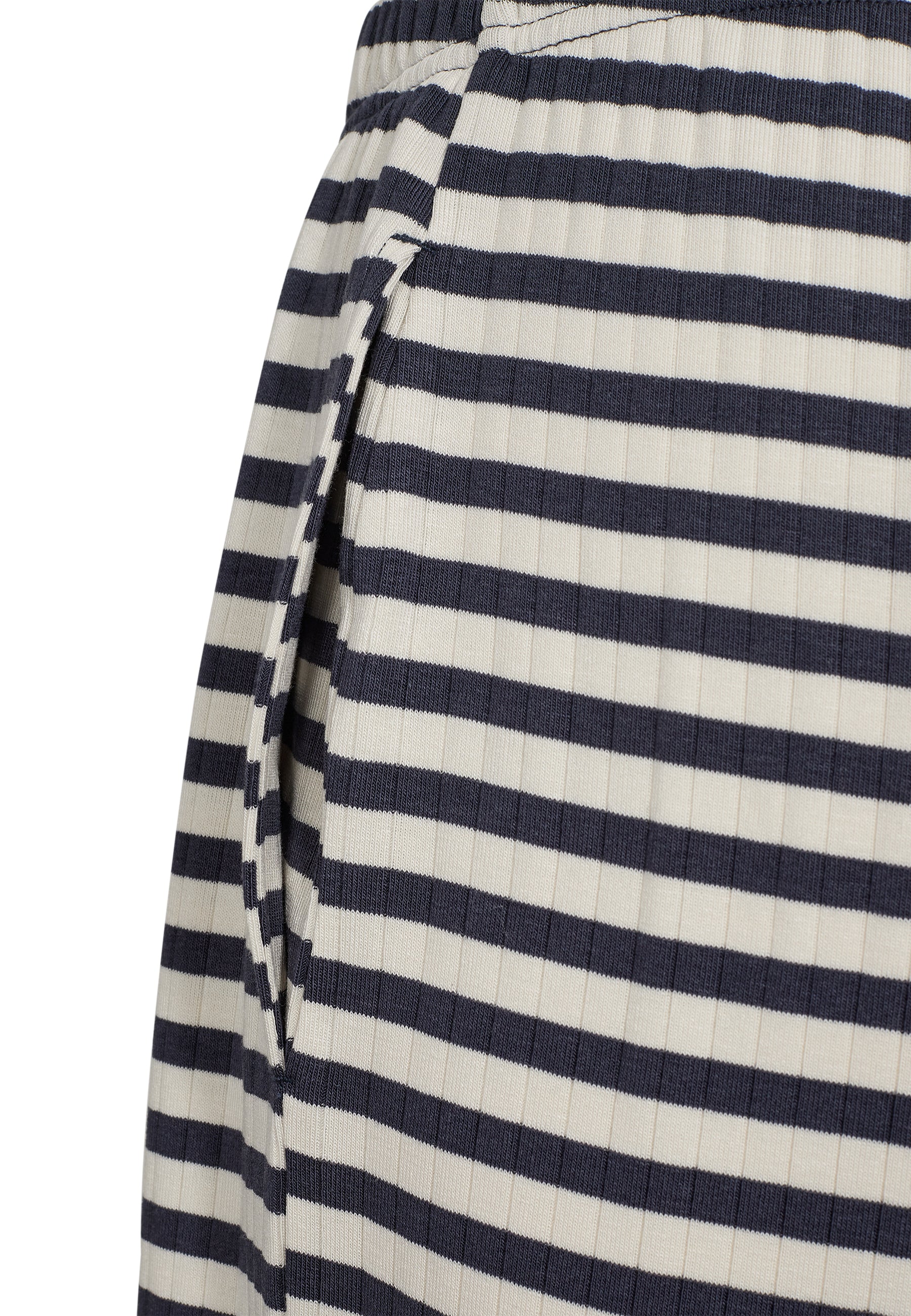 Lækre pyjamasbukser fra JBS i lækker ribkvalitet. Bukserne er blå og hvid stribede og har en god vidde i benene. Der er skrålommer i siderne og bindebånd i linningen.