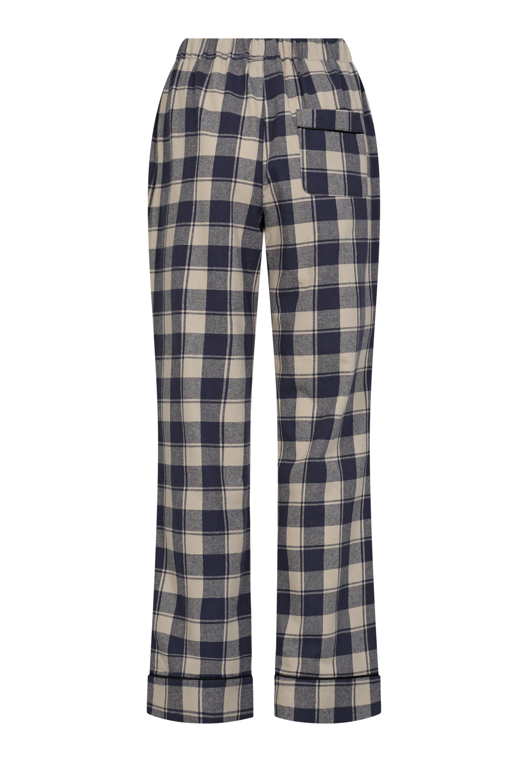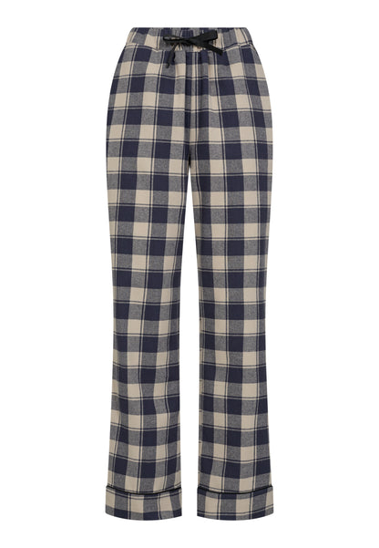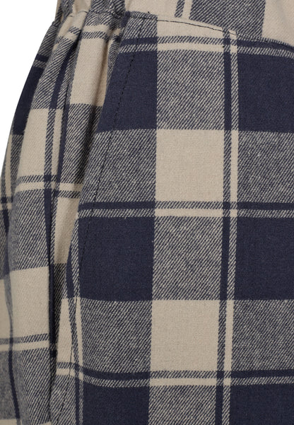 Skønne flonel pyjamasbukser fra JBS. De ternede natbukser har skrålommer i siderne og bredt opsmøg ved benene. Pyjamasbukserne bindes i livet med bredt bånd og har en sød lille lomme bagpå.