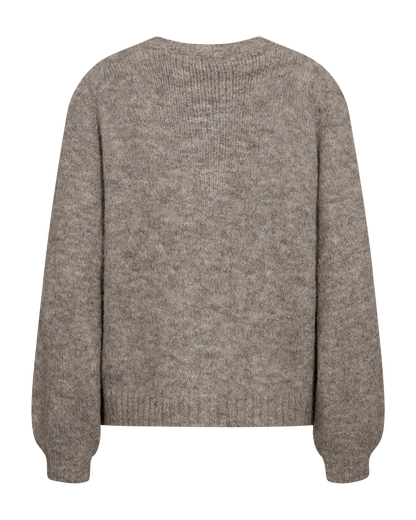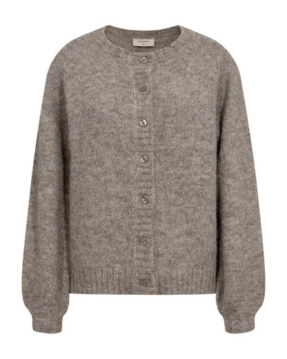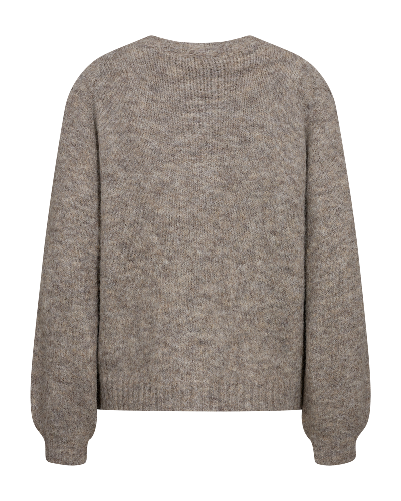 Brunmeleret strik cardigan fra Freequent med fine ballonærmer. Perfekt til et par mørkebrune bukser eller til din sorte nederdel.