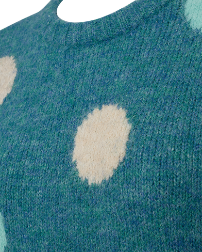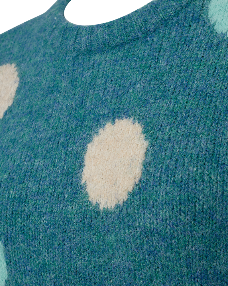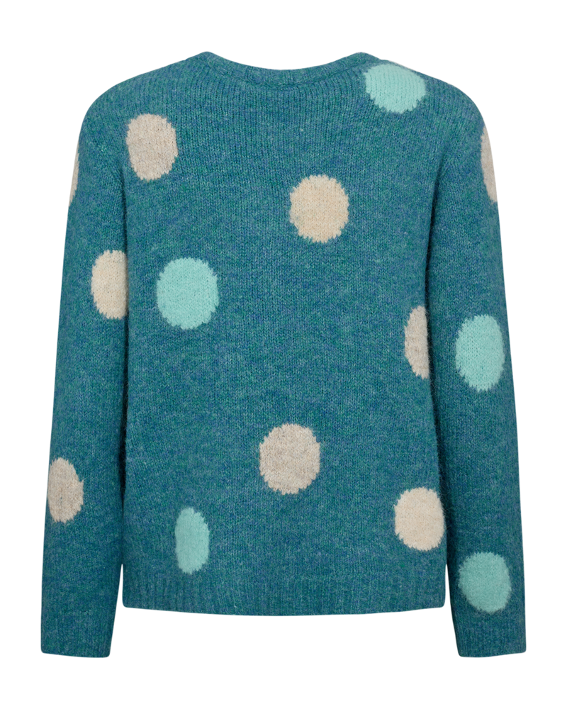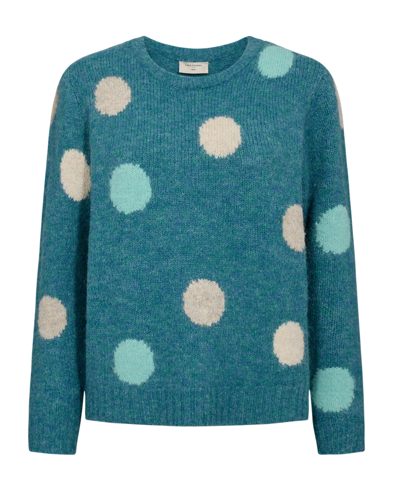 Er du også vild med den flotte petrol farve til efteråret? Den fine Louisa strikbluse fra Freequent er lavet i en lækker petroleumsblå farve med store bomber i beige og mint. Style strikken til dine jeans eller til beige bukser, hvis du stadig gerne vil have et lyst outfit.