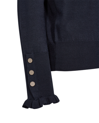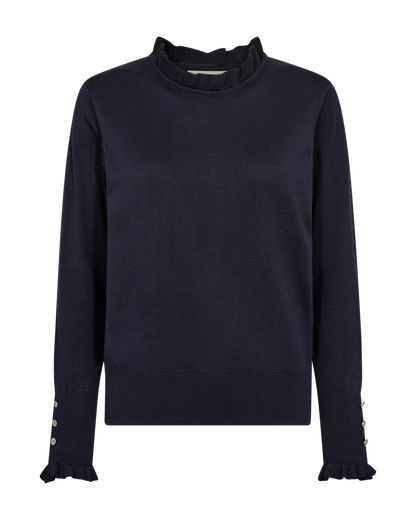 Feminin strikbluse fra Freequent i en lækker, mørkeblå farve. Strikken har søde flæsedetaljer ved halsudskæringen og ærmerne. Manchetterne er afsluttet med fine knapper.