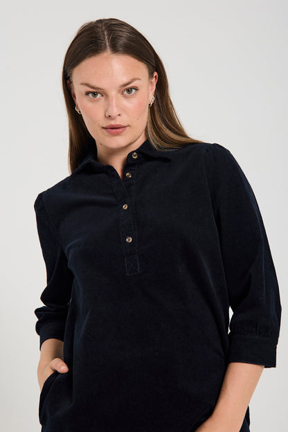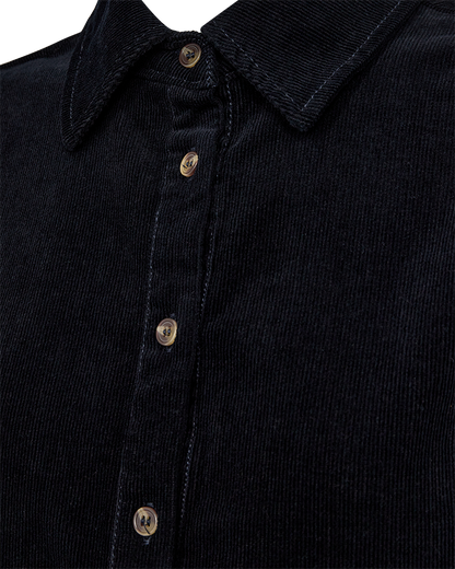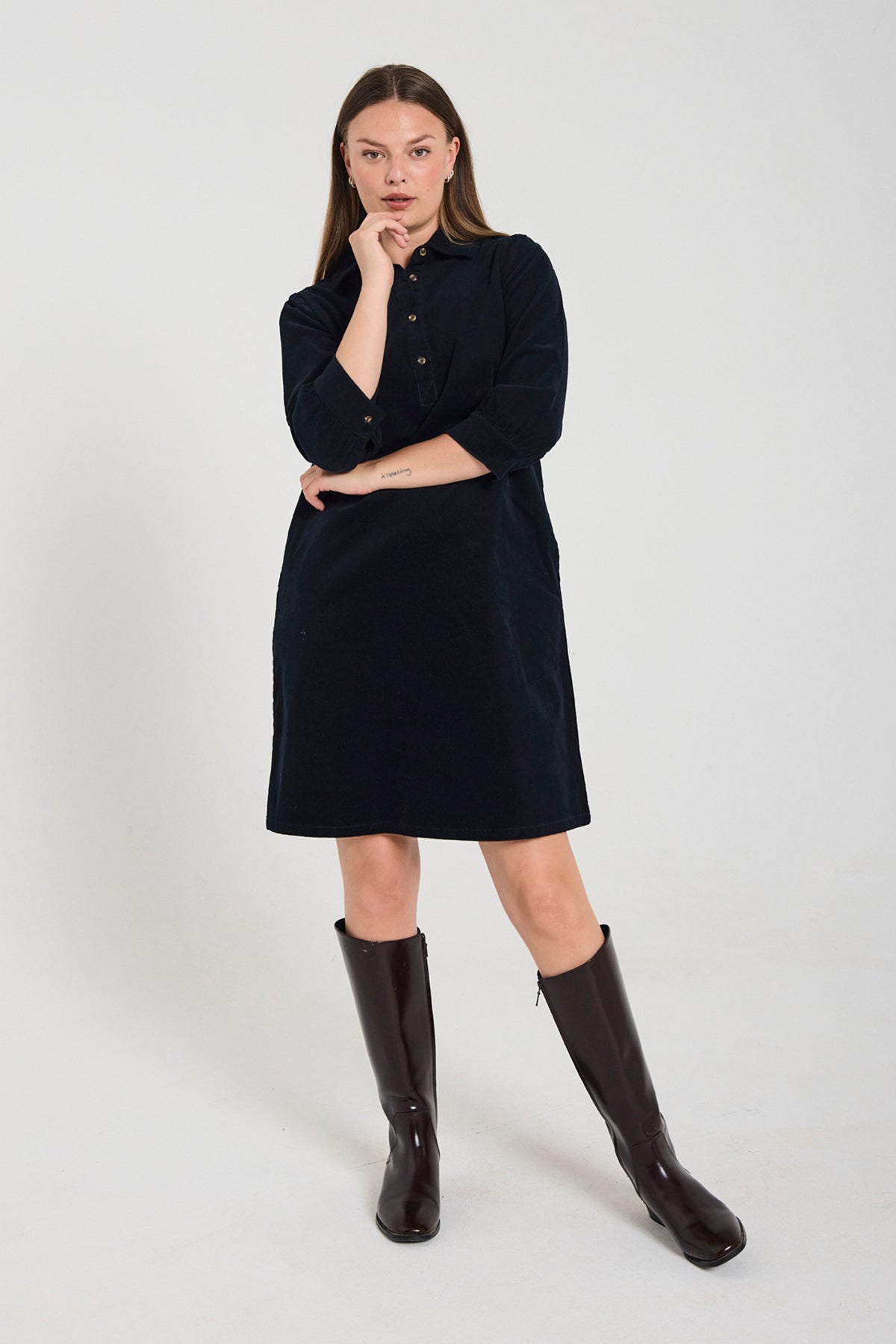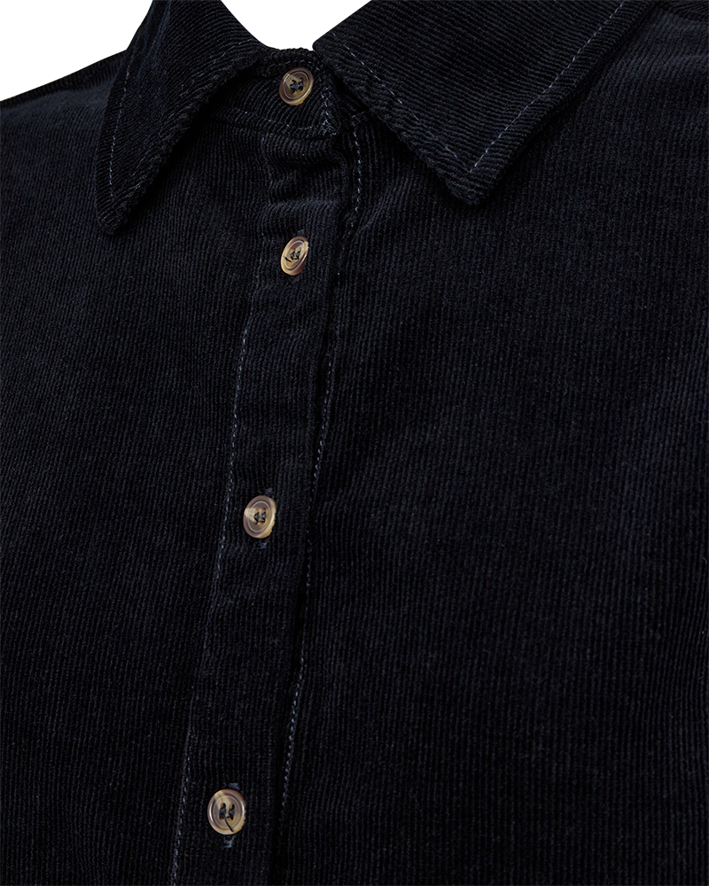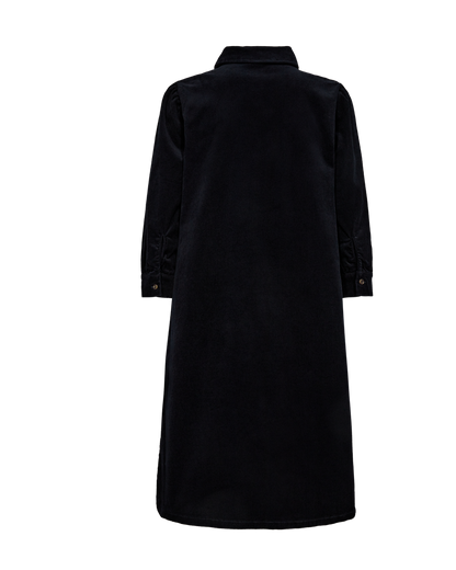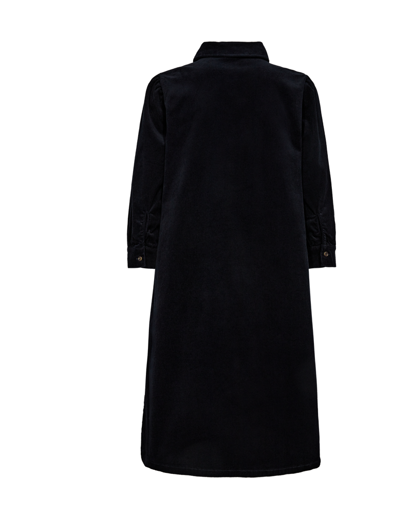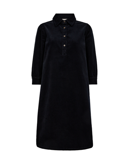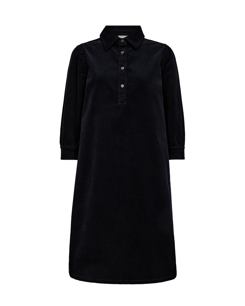 Fed kjole fra Freequent i mørkeblå babyfløjl. Kjolen har klassisk skjortekrave og 3/4 lange ærmer. Snittet er en fin a-facon. Style med høje støvler, som du ser på billedet.