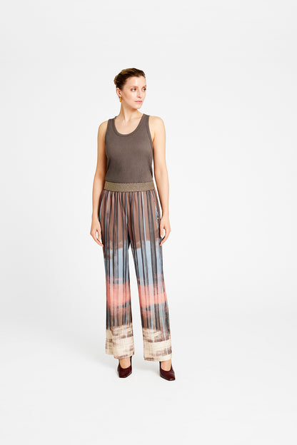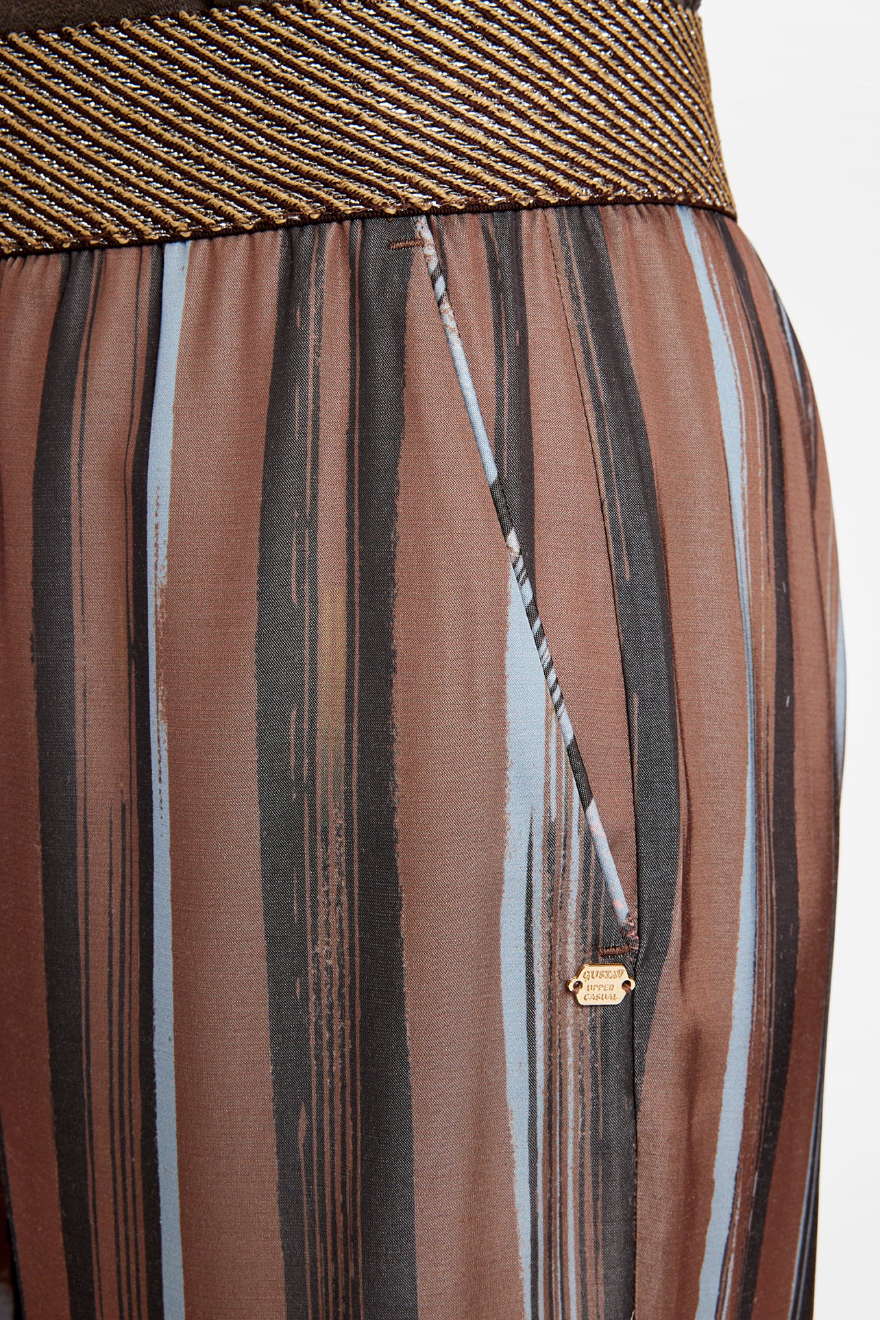 De fine Bay bukser fra Gustav er kommet i en lækker brun farve, der smelter flot sammen med rosa og beige, så du får et skønt batik look her til efteråret. Bay buksen har elastik i linningen og skrålommer i siderne. Perfekt at style med den fine Annsofie bluse i samme print, så du får et helt sæt. Hvis du gerne vil have lidt variation, er busken også fin med den lyse Coya strikbluse.