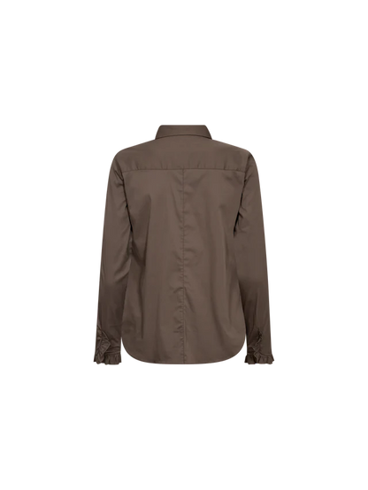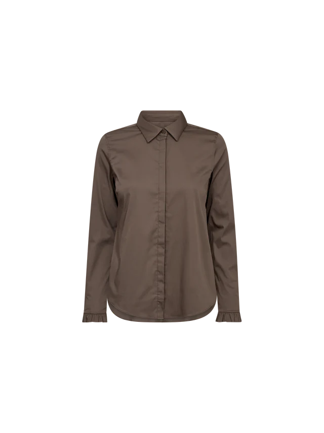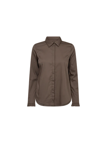 Taljeret skjorte fra Mos Mosh i en lækker, nougatbrun farve. Der er fine flæser ved manchetterne og klassisk krave og knaplukning. Materialet er blødt og strækbart, så skjorten er virkelig lækker at have på. Style til et par sorte jeans eller bukser og sæt en strik eller blazer over på de kolde efterårsdage.