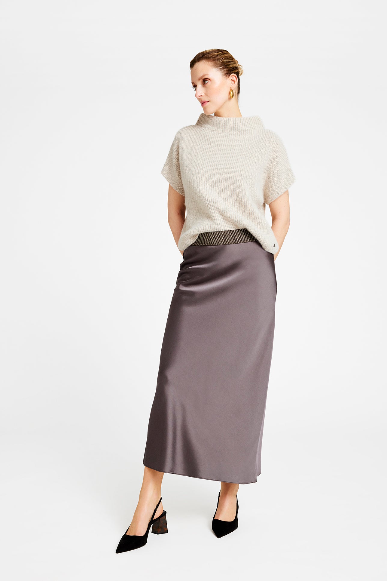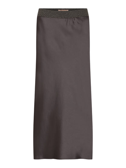 Den populære bias cut nederdel fra Gustav er kommet i en flot, brun farve. Nederdelen sidder til foroven og har den brede elastikkant i linningen. Style med en lys strik, hvis du gerne vil fremhæve den brune farve på nederdelen.