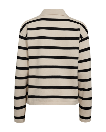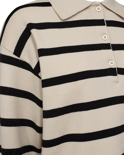 Skøn strikket polo fra Freequent i off white og sort. Den stribede polo har klassisk krave og lukkes med tre knapper øverst. Perfekt til dine sorte bukser og nederdele. Gå all in på det eftertragtede prep look med loafers og culotte bukser. Du finder også den fine polo i bordeaux og off white.