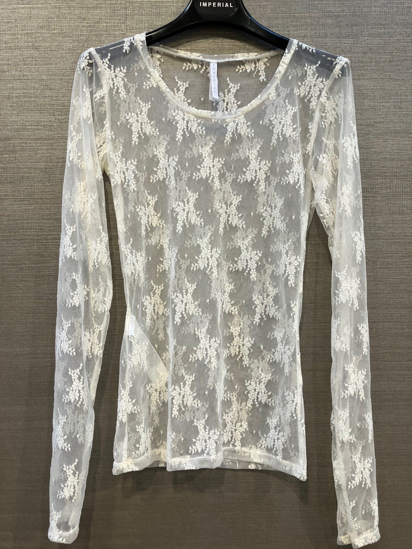 Super elegant blondebluse fra Imperial i off white. Den langærmede bluse er perfekt at style under din blazer eller strik. Har du forelsket dig i den smukke Imperial buksedragt, er det også oplagt at sætte blondeblusen under, så du lige får et ærme på.