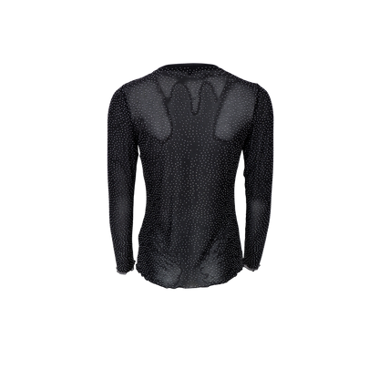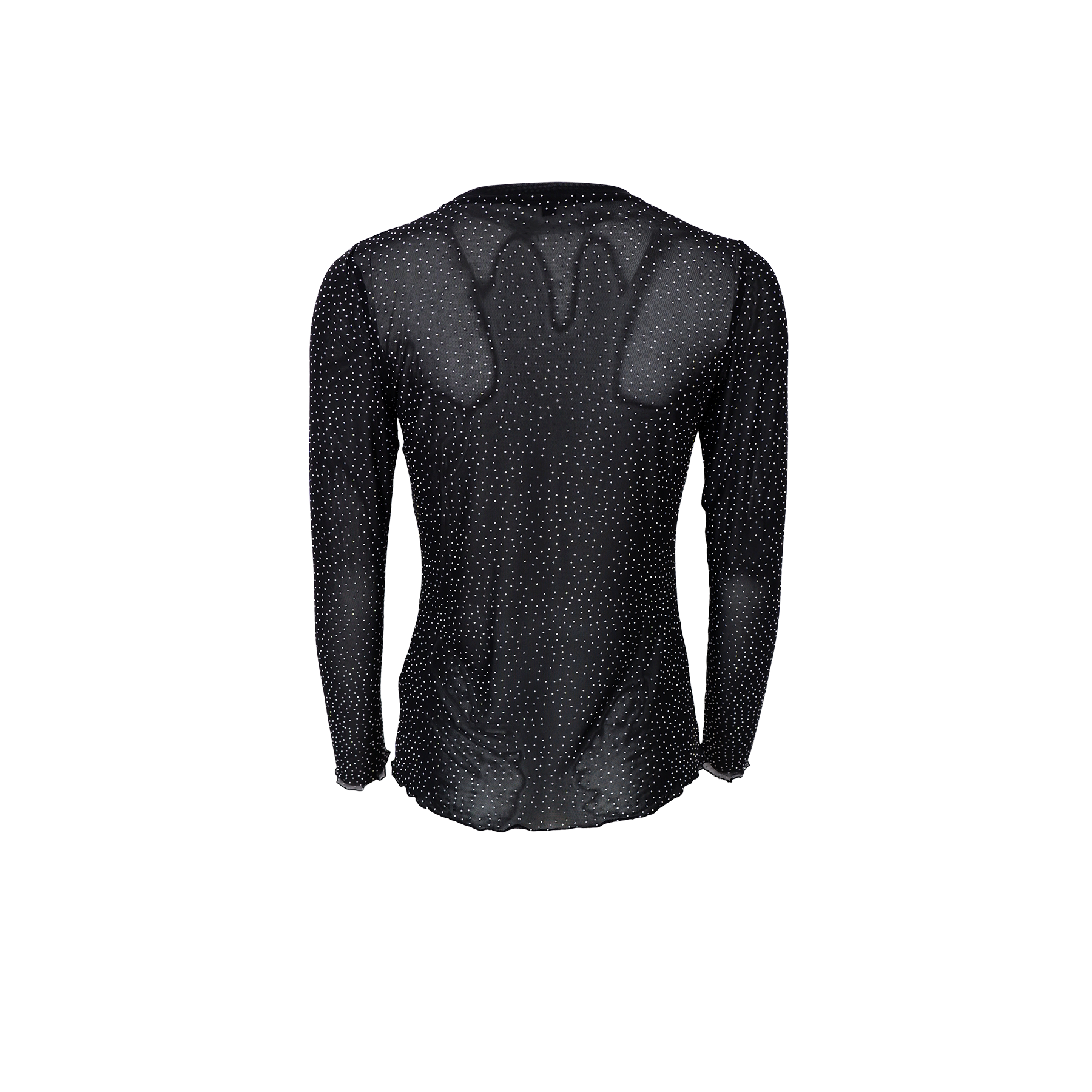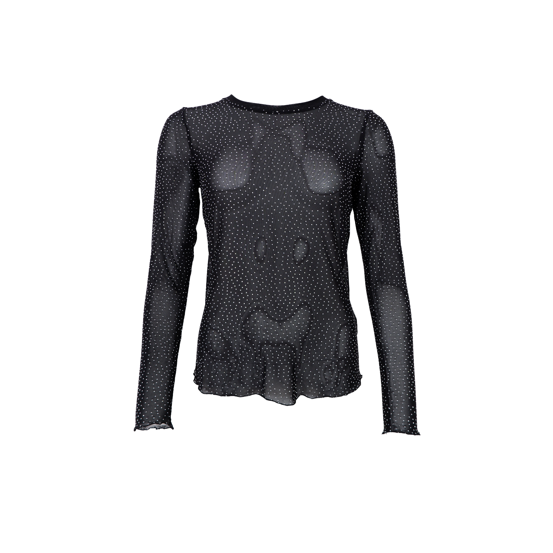 Sort mesh bluse med små, hvide prikker. Blusen er fra Black Colour og er oplagt at bruge under dine strikbluser eller jakker med 3/4 ærmer, som du bruger indendørs.