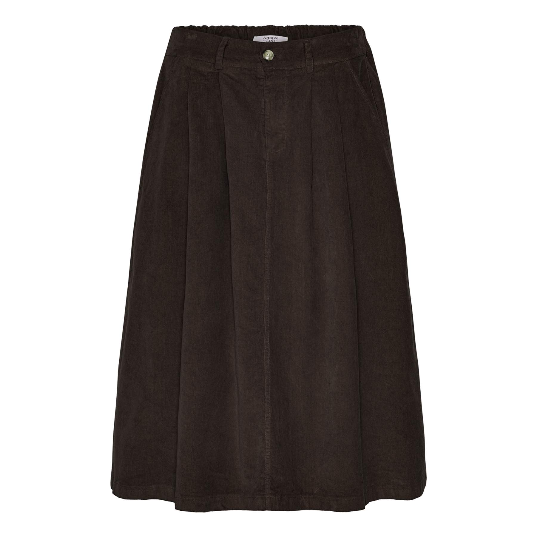 Skøn, mørkebrun nederdel i babyfløjl. Nederdelen har klassisk lukning foran med knap og skjult lynlås, og bagpå er der elastik i linningen, så du føler dig tilpas, når du har nederdelen på. Style med en lækker strik og et par fede støvler.
