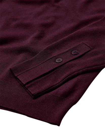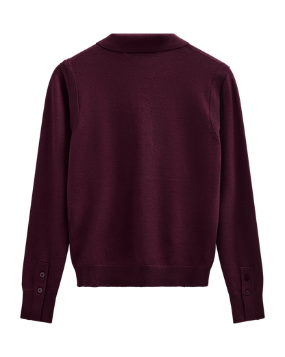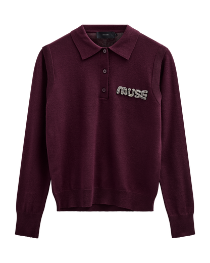 Elegant strik polo fra Copenhagen Muse i finstrikket viskoseblanding. Den bordeaux farve har en flot dybde og bliver ekstra fin af similistenene der danner teksten Muse på venstre bryst. Poloen har slids og knapper ved manchetterne. En super flot bluse, som du styler til grå bukser, hvis du gerne vil fremhæve den bordeaux farve.
