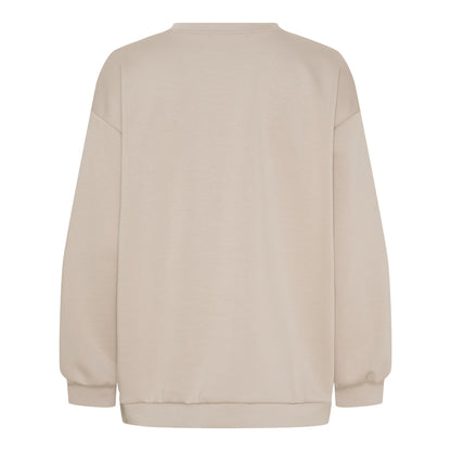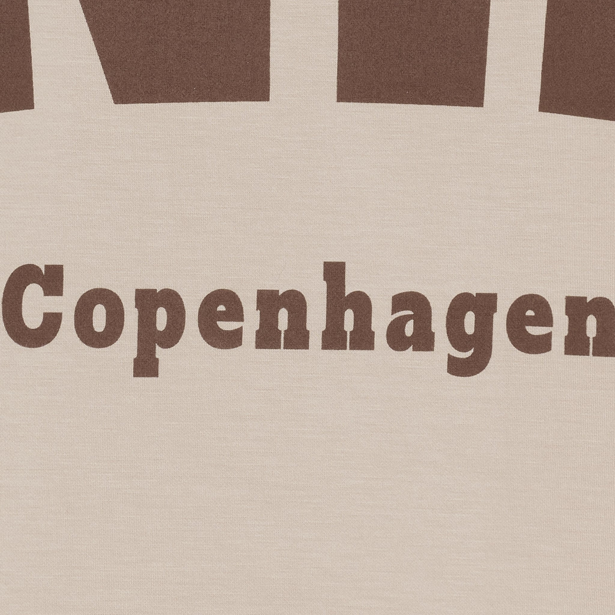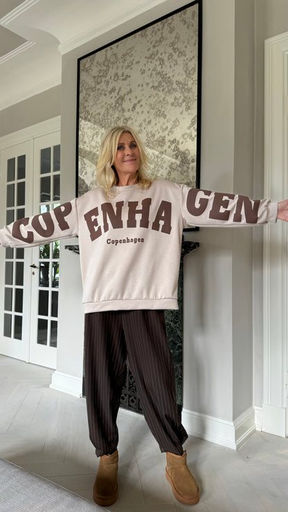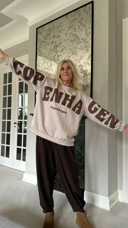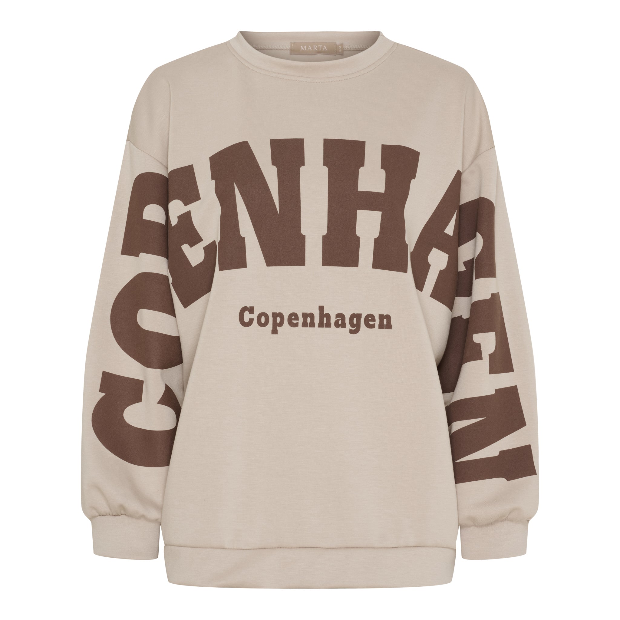Fed sweatshirt fra Marta du Château med teksten "Copenhagen" skrevet fra det ene ærme til det andet henover brystet. Den varme beige farve er flot sammen med den mørkebrune skrift. Style til en brun nederdel eller et par brune bukser og fremhæv de varme toner i dit outfit.
